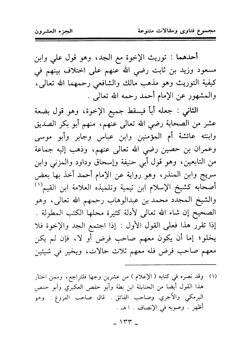 أحدهما: توريث الإخوة مع الجد، وهو قول علي وابن مسعود وزيد بن ثابت رضي الله عنهم على اختلاف بينهم في كيفية التوريث، وهو مذهب مالك والشافعي رحمهما الله تعالى، والمشهور عن الإمام أحمد رحمه الله تعالى.