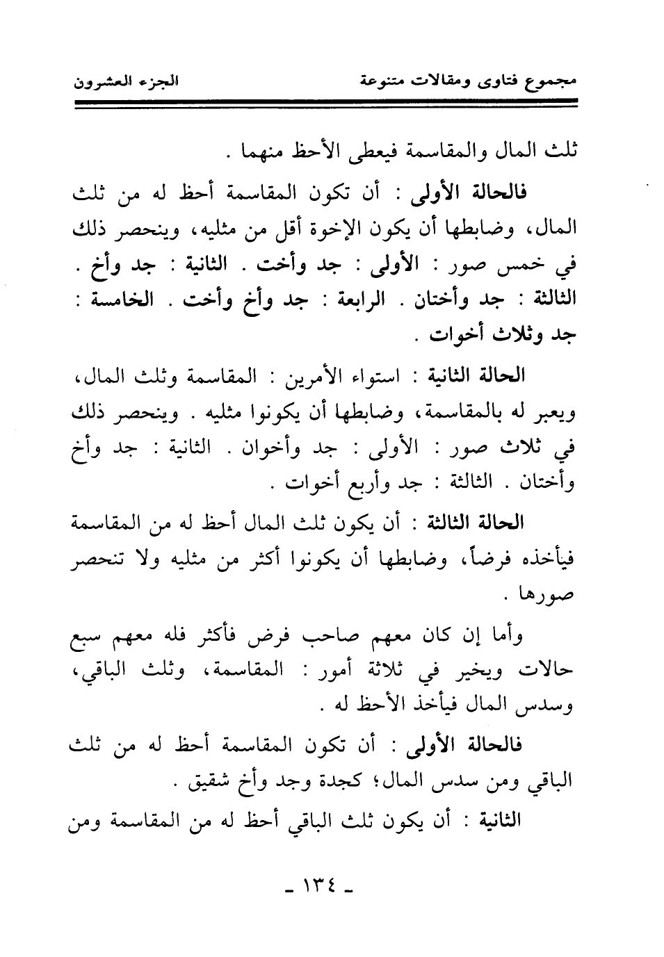 الحالة الثالثة: أن يكون ثلث المال أحظ له من المقاسمة فيأخذه فرضا، وضابطها أن يكونوا أكثر من مثليه ولا تنحصر صورها.