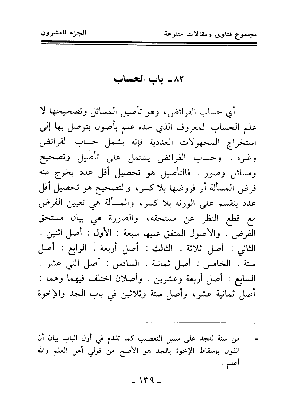 أي حساب الفرائض، وهو تأصيل المسائل وتصحيحها لا علم الحساب المعروف الذي حده علم بأصول يتوصل بها إلى استخراج المجهولات العددية، فإنه يشمل حساب الفرائض وغيره. وحساب الفرائض يشتمل على تأصيل وتصحيح ومسائل وصور. فالتأصيل هو تحصيل أقل عدد يخرج منه فرض المسألة أو فروضها بلا كسر، والتصحيح هو تحصيل أقل عدد ينقسم على الورثة بلا كسر، والمسألة هي تعيين الفرض مع قطع النظر عن مستحقه، والصورة هي بيان مستحق الفرض. والأصول المتفق عليها سبعة: الأول: أصل اثنين. الثاني: أصل ثلاثة. الثالث: أصل أربعة. الرابع: أصل ستة. الخامس: أصل ثمانية. السادس: أصل اثني عشر. السابع: أصل أربعة وعشرين. وأصلان اختلف فيهما وهما: أصل ثمانية عشر، وأصل ستة وثلاثين في باب الجد والإخوة