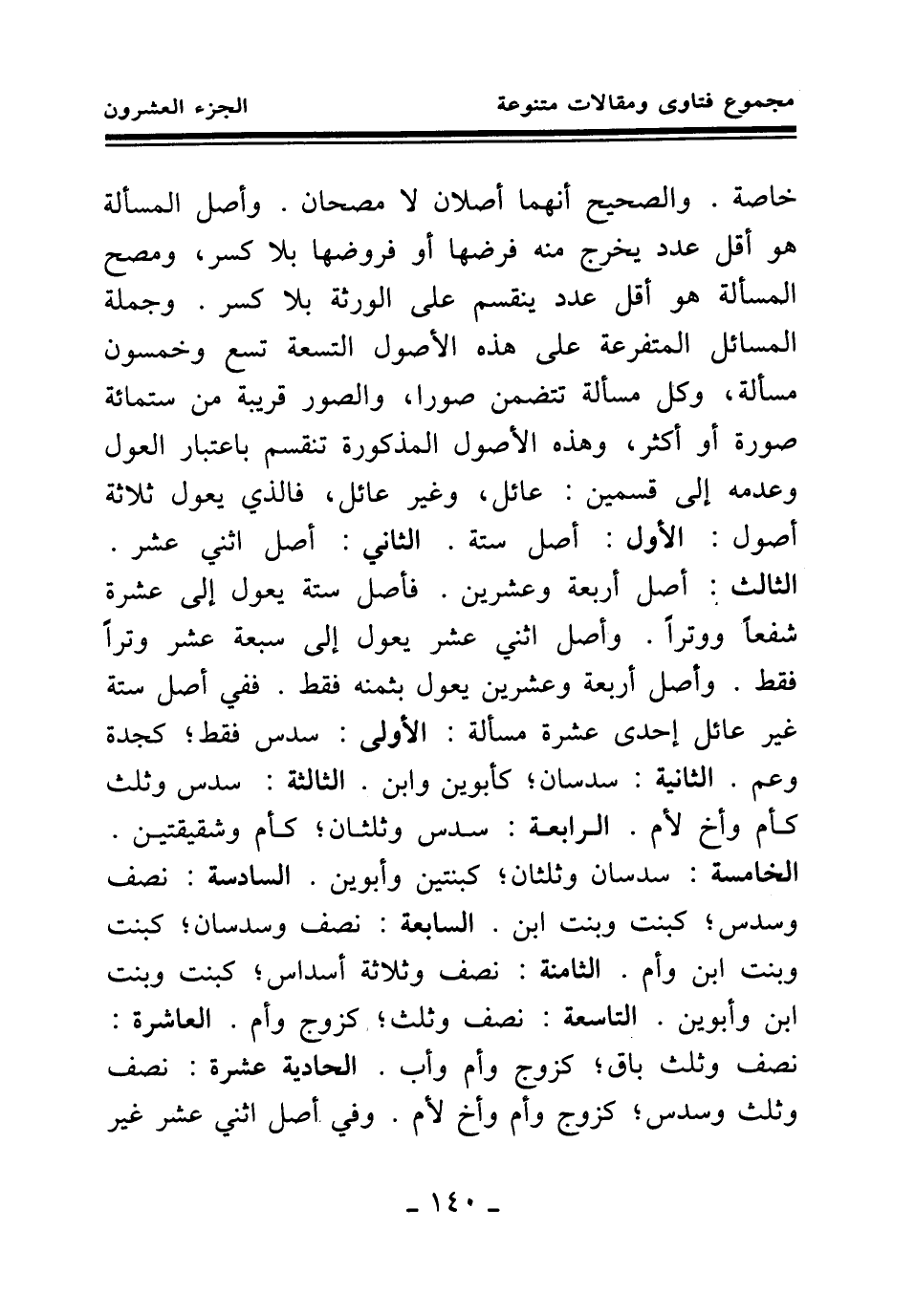 والصحيح أنهما أصلان لا مصحان. وأصل المسألة هو أقل عدد يخرج منه فرضها أو فروضها بلا كسر، ومصح المسألة هو أقل عدد ينقسم على الورثة بلا كسر. وجملة المسائل المتفرعة على هذه الأصول التسعة تسع وخمسون مسألة، وكل مسألة تتضمن صورا، والصور قريبة من ستمائة صورة أو أكثر، وهذه الأصول المذكورة تنقسم باعتبار العول وعدمه إلى قسمين: عائل، وغير عائل، فالذي يعول ثلاثة أصول: الأول: أصل ستة. الثاني: أصل اثني عشر. الثالث: أصل أربعة وعشرين.
