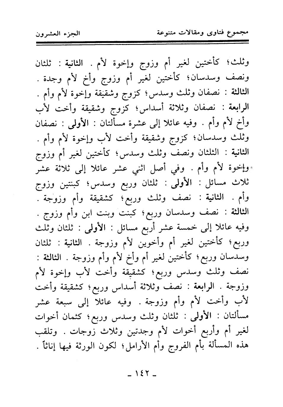 وفيه عائلا إلى سبعة عشر مسألتان: الأولى: ثلثان وثلث وسدس وربع؛ كثمان أخوات لغير أم وأربع أخوات لأم وجدتين وثلاث زوجات. وتلقب هذه المسألة بأم الفروج وأم الأرامل؛ لكون الورثة فيها إناثا.