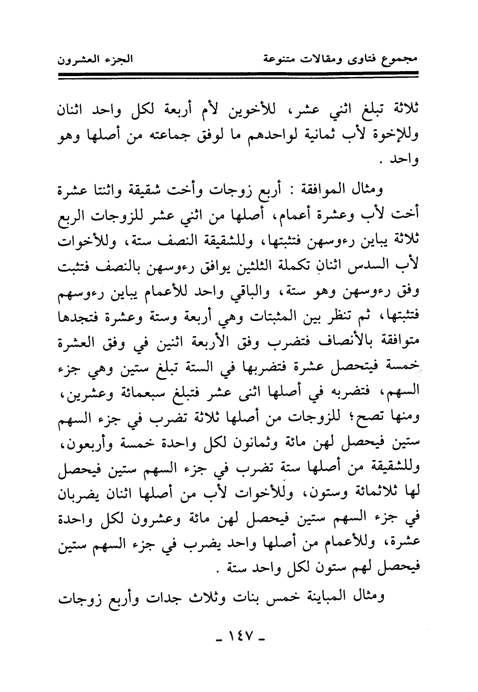 ومثال الموافقة: أربع زوجات وأخت شقيقة واثنتا عشرة أخت لأب وعشرة أعمام، أصلها من اثني عشر للزوجات الربع ثلاثة يباين رءوسهن فتثبتها، وللشقيقة النصف ستة، وللأخوات لأب السدس اثنان تكملة الثلثين يوافق رءوسهن بالنصف، فتثبت وفق رءوسهن وهو ستة، والباقي واحد للأعمام يباين رءوسهم فتثبتها، ثم تنظر بين المثبتات وهي أربعة وستة وعشرة فتجدها متوافقة بالأنصاف، فتضرب وفق الأربعة اثنين في وفق العشرة خمسة، فيتحصل عشرة فتضربها في الستة تبلغ ستين وهي جزء السهم، فتضربه في أصلها اثني عشر فتبلغ سبعمائة وعشرين، ومنها تصح؛ للزوجات من أصلها ثلاثة تضرب في جزء السهم ستين فيحصل لهن مائة وثمانون، لكل واحدة خمسة وأربعون، وللشقيقة من أصلها ستة تضرب في جزء السهم ستين فيحصل لها ثلاثمائة وستون، وللأخوات لأب من أصلها اثنان يضربان في جزء السهم ستين، فيحصل لهن مائة وعشرون لكل واحدة عشرة، وللأعمام من أصلها واحد يضرب في جزء السهم ستين فيحصل لهم ستون لكل واحد ستة.