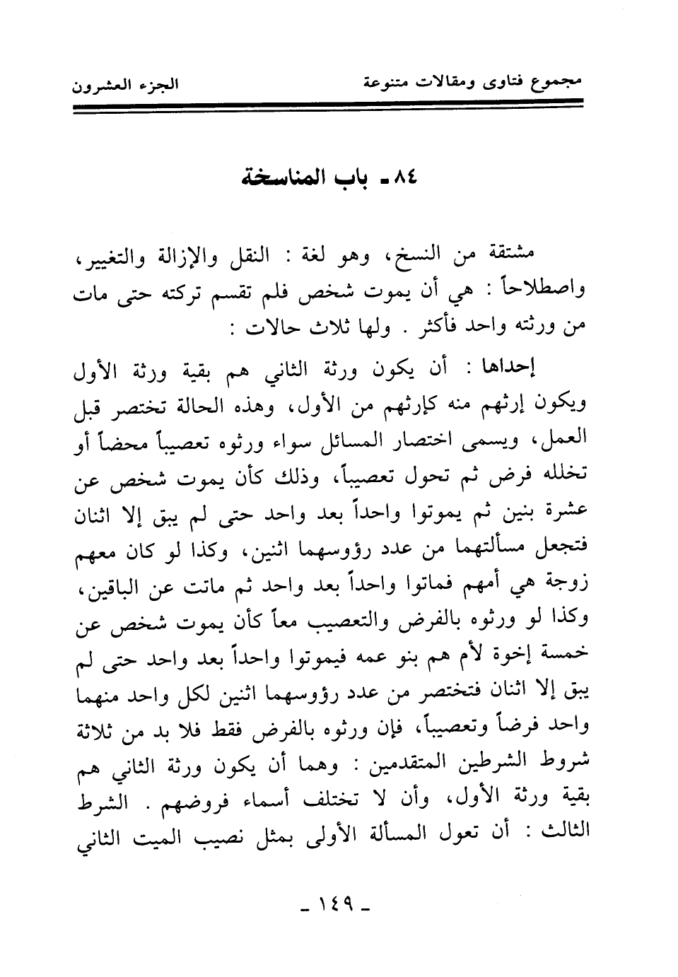 إحداها: أن يكون ورثة الثاني هم بقية ورثة الأول، ويكون إرثهم منه كإرثهم من الأول، وهذه الحالة تختصر قبل العمل، ويسمى اختصار المسائل سواء ورثوه تعصيبا محضا أو تخلله فرض ثم تحول تعصيبا، وذلك كأن يموت شخص عن عشرة بنين ثم يموتوا واحدا بعد واحد حتى لم يبق إلا اثنان، فتجعل مسألتهما من عدد رءوسهما اثنين، وكذا لو كان معهم زوجة هي أمهم فماتوا واحدا بعد واحد ثم ماتت عن الباقين، وكذا لو ورثوه بالفرض والتعصيب معا كأن يموت شخص عن خمسة إخوة لأم هم بنو عمه، فيموتوا واحدا بعد واحد حتى لم يبق إلا اثنان فتختصر من عدد رءوسهما اثنين لكل واحد منهما واحد فرضا وتعصيبا، فإن ورثوه بالفرض فقط فلا بد من ثلاثة شروط الشرطين المتقدمين: وهما أن يكون ورثة الثاني هم بقية ورثة الأول، وأن لا تختلف أسماء فروضهم.
