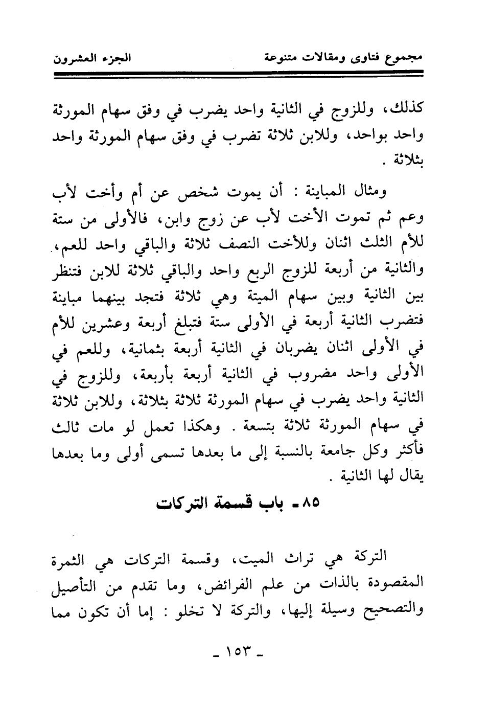 ومثال المباينة: أن يموت شخص عن أم وأخت لأب وعم، ثم تموت الأخت لأب عن زوج وابن، فالأولى من ستة للأم الثلث اثنان وللأخت النصف ثلاثة والباقي واحد للعم،. والثانية من أربعة للزوج الربع واحد والباقي ثلاثة للابن، فتنظر بين الثانية وبين سهام الميتة وهي ثلاثة فتجد بينهما مباينة، فتضرب الثانية أربعه في الأولى ستة فتبلغ أربعة وعشرين للأم في الأولى اثنان يضربان في الثانية أربعة بثمانية، وللعم في الأولى واحد مضروب في الثانية أربعة بأربعة، وللزوج في الثانية واحد يضرب في سهام المورثة ثلاثة بثلاثة، وللابن ثلاثة في سهام المورثة ثلاثة بتسعة. وهكذا تعمل لو مات ثالث فأكثر، وكل جامعة بالنسبة إلى ما بعدها تسمى أولى وما بعدها يقال لها: الثانية.