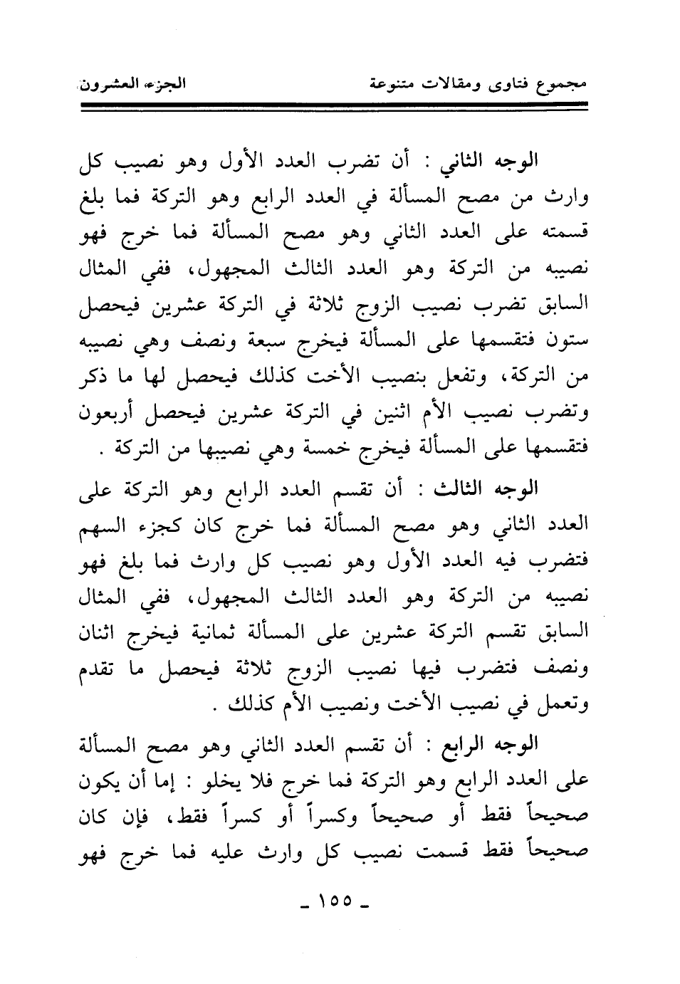 الوجه الثالث: أن تقسم العدد الرابع وهو التركة على العدد الثاني وهو مصح المسألة، فما خرج كان كجزء السهم فتضرب فيه العدد الأول وهو نصيب كل وارث، فما بلغ فهو نصيبه من التركة وهو العدد الثالث المجهول، ففي المثال السابق تقسم التركة عشرين على المسألة ثمانية، فيخرج اثنان ونصف فتضرب فيها نصيب الزوج ثلاثة فيحصل ما تقدم، وتعمل في نصيب الأخت ونصيب الأم كذلك.