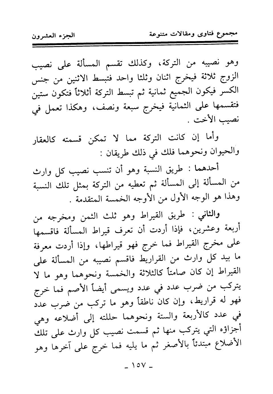 والثاني: طريق القيراط وهو ثلث الثمن ومخرجه من أربعة وعشرين، فإذا أردت أن تعرف قيراط المسألة فاقسمها على مخرج القيراط فما خرج فهو قيراطها، وإذا أردت معرفة ما بيد كل وارث من القراريط فاقسم نصيبه من المسألة على القيراط إن كان صامتا كالثلاثة والخمسة ونحوهما، وهو ما لا يتركب من ضرب عدد في عدد ويسمى أيضا الأصم، فما خرج فهو له قراريط، وإن كان ناطقا وهو ما تركب من ضرب عدد في عدد كالأربعة والستة ونحوهما حللته إلى أضلاعه وهي أجزاؤه التي يتركب منها، ثم قسمت نصيب كل وارث على تلك الأضلاع مبتدئا بالأصغر، ثم ما يليه فما خرج على آخرها وهو