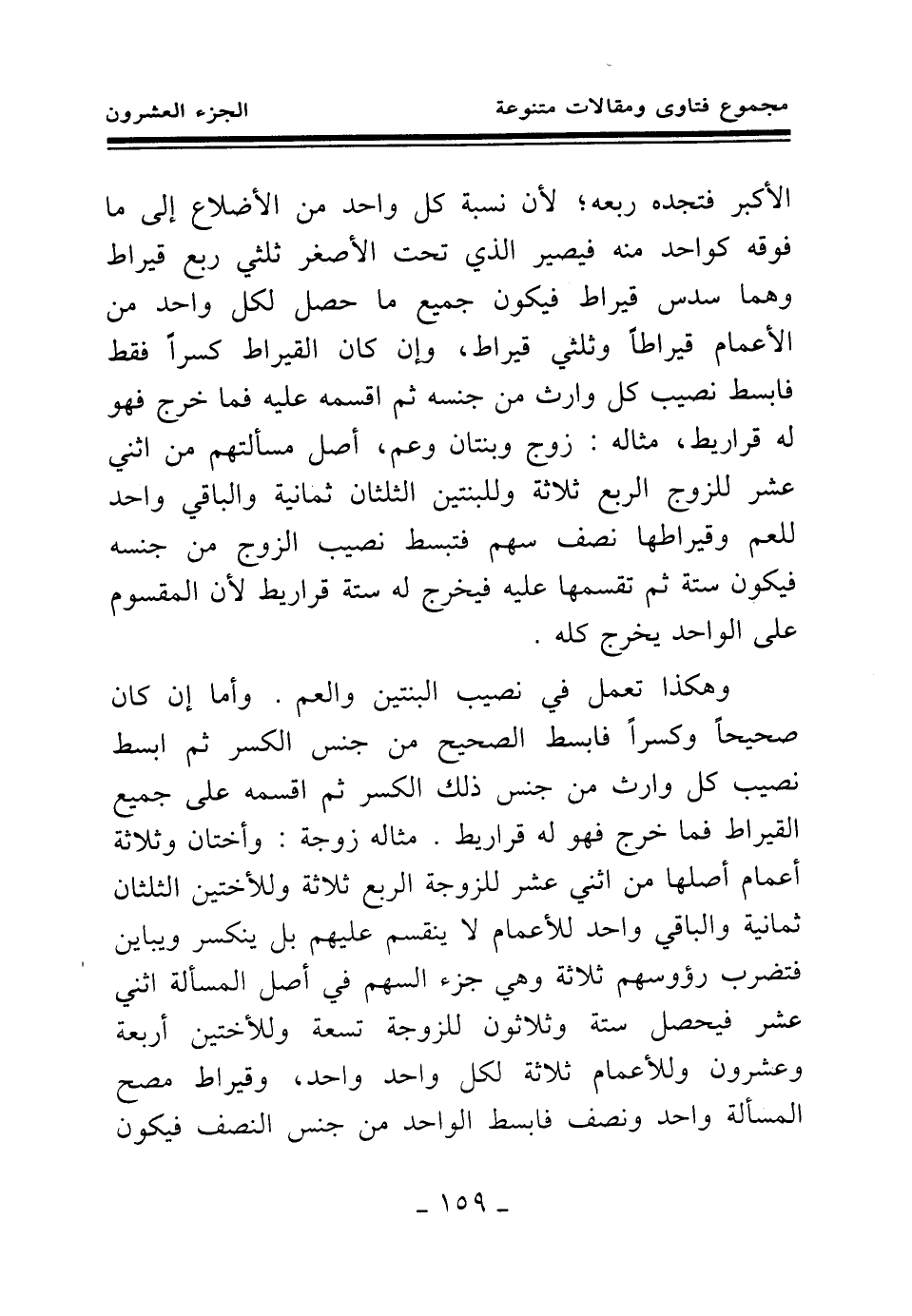 وهكذا تعمل في نصيب البنتين والعم. وأما إن كان صحيحا وكسرا فابسط الصحيح من جنس الكسر، ثم ابسط نصيب كل وارث من جنس ذلك الكسر، ثم اقسمه على جميع القيراط فما خرج فهو له قراريط. مثاله زوجة: وأختان وثلاثة أعمام أصلها من اثني عشر للزوجة الربع ثلاثة وللأختين الثلثان ثمانية والباقي واحد للأعمام لا ينقسم عليهم بل ينكسر ويباين فتضرب رءوسهم ثلاثة، وهي جزء السهم في أصل المسألة اثني عشر فيحصل ستة وثلاثون للزوجة تسعة، وللأختين أربعة وعشرون، وللأعمام ثلاثة لكل واحد واحد، وقيراط مصح المسألة واحد ونصف فابسط الواحد من جنس النصف فيكون