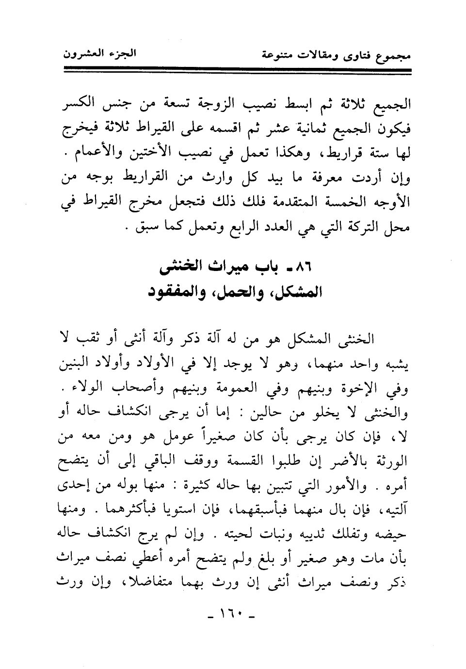 الخنثى المشكل هو من له آلة ذكر وآلة أنثى أو ثقب لا يشبه واحدا منهما، وهو لا يوجد إلا في الأولاد وأولاد البنين، وفي الإخوة وبنيهم، وفي العمومة وبنيهم وأصحاب الولاء. والخنثى لا يخلو من حالين: إما أن يرجى انكشاف حاله أو لا، فإن كان يرجى بأن كان صغيرا عومل هو ومن معه من الورثة بالأضر إن طلبوا القسمة، ووقف الباقي إلى أن يتضح أمره. والأمور التي تتبين بها حاله كثيرة: منها بوله من إحدى آلتيه، فإن بال منهما فبأسبقهما، فإن استويا فبأكثرهما. ومنها حيضه وتفلك ثدييه ونبات لحيته. وإن لم يرج انكشاف حاله بأن مات وهو صغير، أو بلغ ولم يتضح أمره أعطي نصف ميراث ذكر ونصف ميراث أنثى إن ورث بهما متفاضلا، وإن ورث