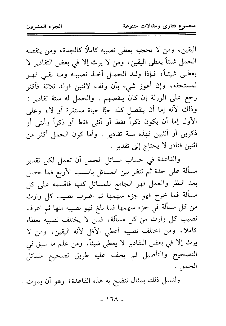 اليقين، ومن لا يحجبه يعطى نصيبه كاملا كالجدة، ومن ينقصه الحمل شيئا يعطى اليقين، ومن لا يرث إلا في بعض التقادير لا يعطى شيئا، فإذا ولد الحمل أخذ نصيبه وما بقي فهو لمستحقه، وإن أعوز شيء بأن وقف لاثنين فولد ثلاثة فأكثر رجع على الورثة إن كان ينقصهم. والحمل له ستة تقادير: وذلك لأنه إما أن ينفصل كله حيا حياة مستقرة أو لا، وعلى الأول إما أن يكون ذكرا فقط أو أنثى، فأنثى أو ذكرا وأنثى أو ذكرين أو أنثيين فهذه ستة تقادير. وأما كون الحمل أكثر من اثنين فنادر لا يحتاج إلى تقدير.