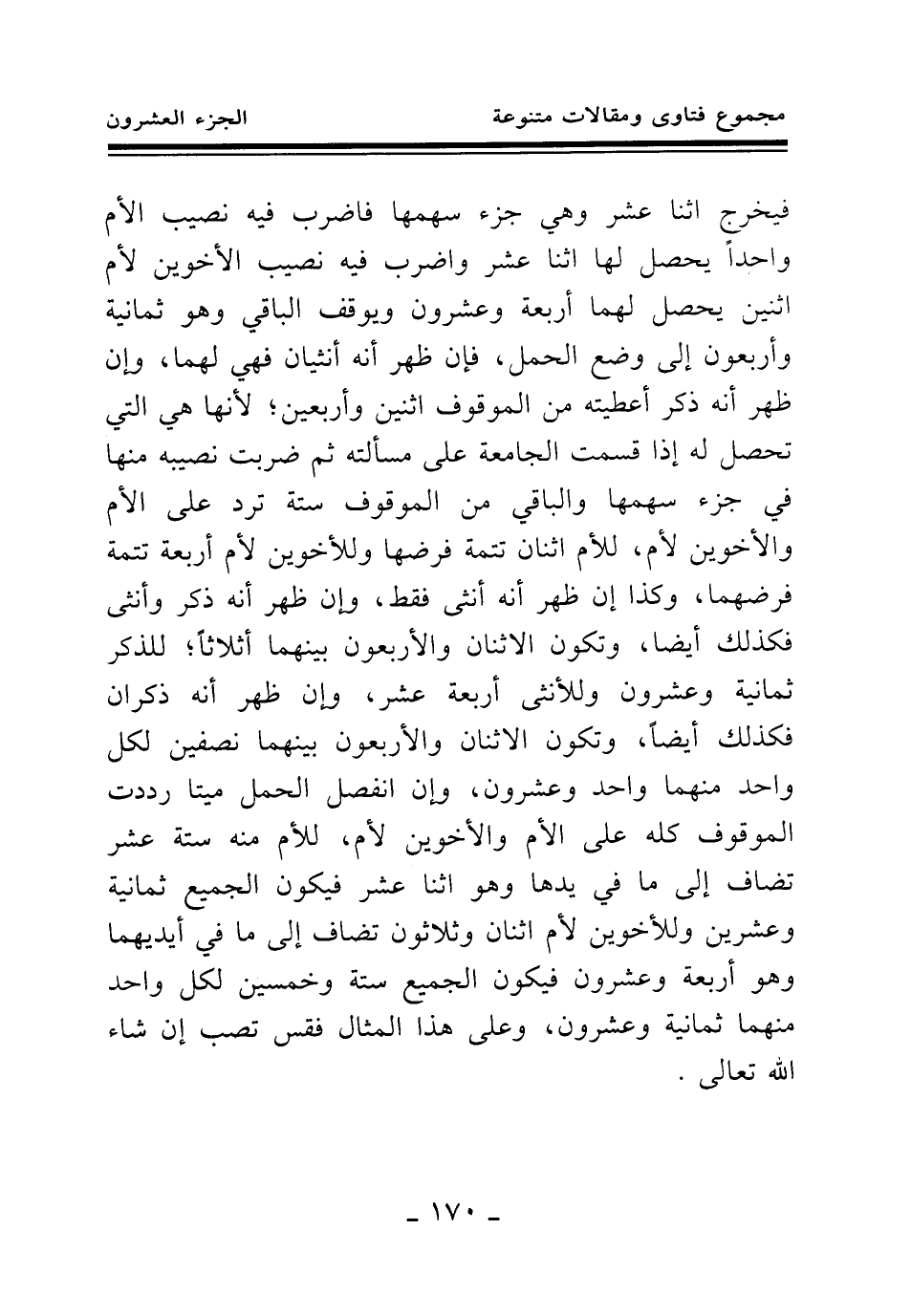فيخرج اثنا عشر وهي جزء سهمها فاضرب فيه نصيب الأم واحدا، يحصل لها اثنا عشر، واضرب فيه نصيب الأخوين لأم اثنين يحصل لهما أربعة وعشرون، ويوقف الباقي وهو ثمانية وأربعون إلى وضع الحمل، فإن ظهر أنه أنثيان فهي لهما، وإن ظهر أنه ذكر أعطيته من الموقوف اثنين وأربعين؛ لأنها هي التي تحصل له إذا قسمت الجامعة على مسألته، ثم ضربت نصيبه منها في جزء سهمها، والباقي من الموقوف ستة ترد على الأم والأخوين لأم، للأم اثنان تتمة فرضها وللأخوين لأم أربعة تتمة فرضهما، وكذا إن ظهر أنه أنثى فقط، وإن ظهر أنه ذكر وأنثى فكذلك أيضا، وتكون الاثنان والأربعون بينهما أثلاثا؛ للذكر ثمانية وعشرون وللأنثى أربعة عشر، وإن ظهر أنه ذكران فكذلك أيضا، وتكون الاثنان والأربعون بينهما نصفين لكل واحد منهما واحد وعشرون، وإن انفصل الحمل ميتا رددت الموقوف كله على الأم والأخوين لأم، للأم منه ستة عشر تضاف إلى ما في يدها وهو اثنا عشر، فيكون الجميع ثمانية وعشرين وللأخوين لأم اثنان وثلاثون تضاف إلى ما في أيديهما وهو أربعة وعشرون، فيكون الجميع ستة وخمسين لكل واحد منهما ثمانية وعشرون، وعلى هذا المثال فقس تصب إن شاء الله تعالى.
