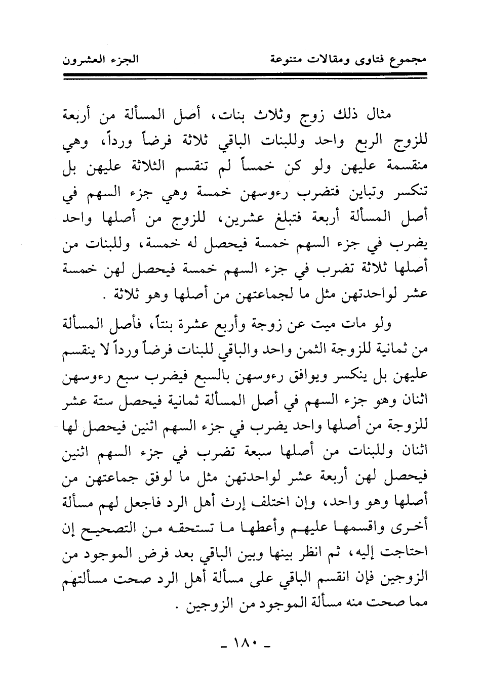 مثال ذلك زوج وثلاث بنات، أصل المسألة من أربعة للزوج الربع واحد وللبنات الباقي ثلاثة فرضا وردا، وهي منقسمة عليهن ولو كن خمسا لم تنقسم الثلاثة عليهن بل تنكسر وتباين فتضرب رءوسهن خمسة وهي جزء السهم في أصل المسألة أربعة فتبلغ عشرين، للزوج من أصلها واحد يضرب في جزء السهم خمسة فيحصل له خمسة، وللبنات من أصلها ثلاثة تضرب في جزء السهم خمسة فيحصل لهن خمسة عشر لواحدتهن مثل ما لجماعتهن من أصلها وهو ثلاثة.