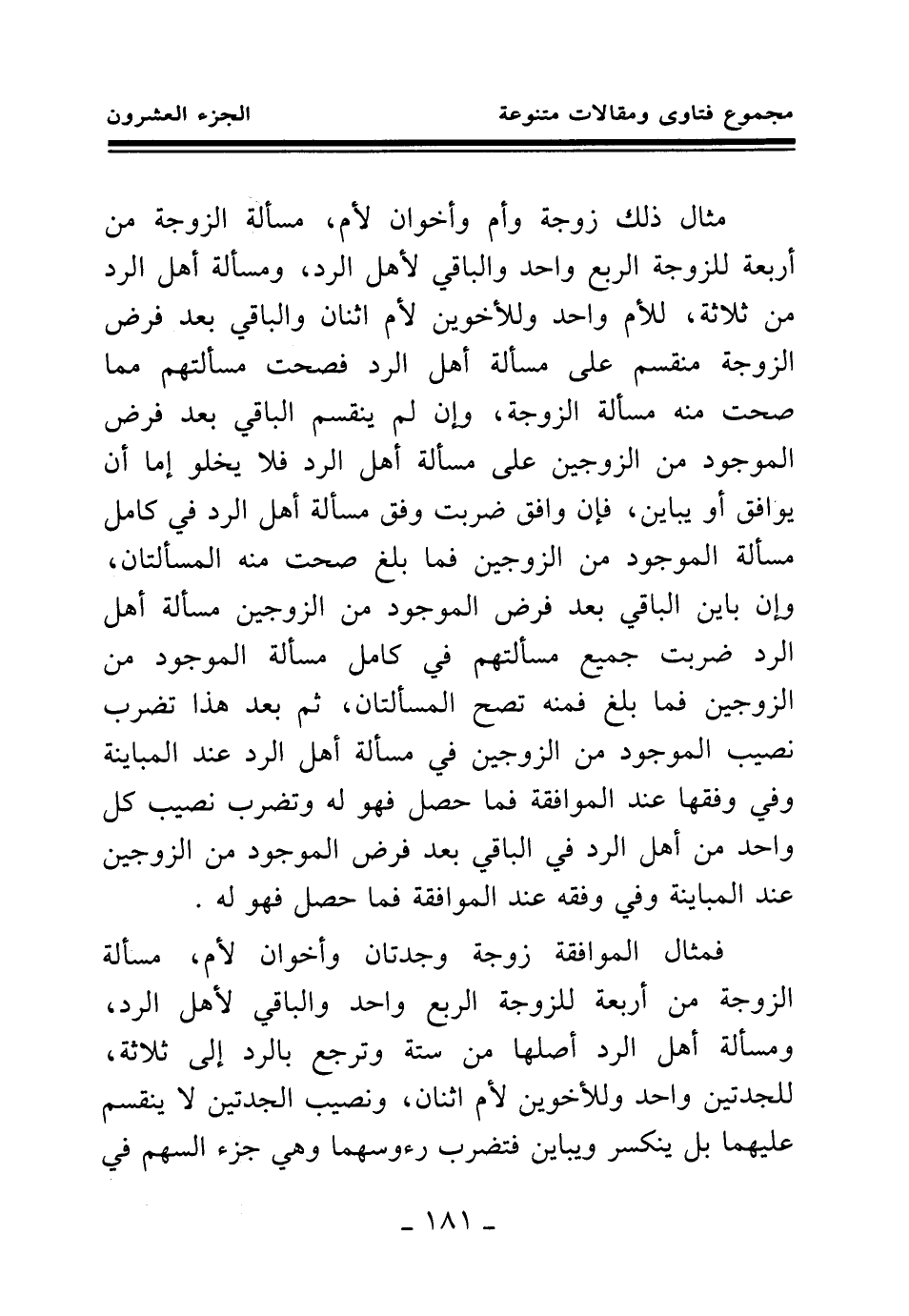 مثال ذلك زوجة وأم وأخوان لأم، مسألة الزوجة من أربعة للزوجة الربع واحد والباقي لأهل الرد، ومسألة أهل الرد من ثلاثة، للأم واحد وللأخوين لأم اثنان والباقي بعد فرض الزوجة منقسم على مسألة أهل الرد فصحت مسألتهم مما صحت منه مسألة الزوجة، وإن لم ينقسم الباقي بعد فرض الموجود من الزوجين على مسألة أهل الرد فلا يخلو إما أن يوافق أو يباين، فإن وافق ضربت وفق مسألة أهل الرد في كامل مسألة الموجود من الزوجين فما بلغ صحت منه المسألتان، وإن باين الباقي بعد فرض الموجود من الزوجين مسألة أهل الرد ضربت جميع مسألتهم في كامل مسألة الموجود من الزوجين فما بلغ فمنه تصح المسألتان، ثم بعد هذا تضرب نصيب الموجود من الزوجين في مسألة أهل الرد عند المباينة وفي وفقها عند الموافقة فما حصل فهو له، وتضرب نصيب كل واحد من أهل الرد في الباقي بعد فرض الموجود من الزوجين عند المباينة وفي وفقه عند الموافقة فما حصل فهو له.