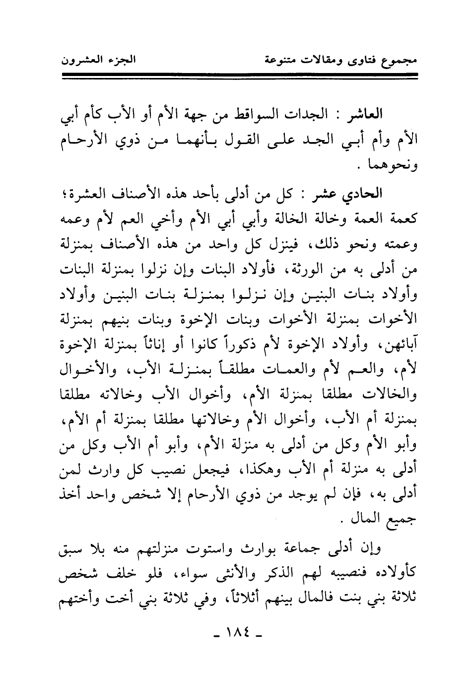 الحادي عشر: كل من أدلى بأحد هذه الأصناف العشرة؛ كعمة العمة وخالة الخالة وأبي أبي الأم وأخي العم لأم وعمه وعمته ونحو ذلك، فينزل كل واحد من هذه الأصناف بمنزلة من أدلى به من الورثة، فأولاد البنات وإن نزلوا بمنزلة البنات وأولاد بنات البنين وإن نزلوا بمنزلة بنات البنين وأولاد الأخوات بمنزلة الأخوات وبنات الإخوة وبنات بنيهم بمنزلة آبائهن، وأولاد الإخوة لأم ذكورا كانوا أو إناثا بمنزلة الإخوة لأم، والعم لأم والعمات مطلقا بمنزلة الأب، والأخوال والخالات مطلقا بمنزلة الأم، وأخوال الأب وخالاته مطلقا بمنزلة أم الأب، وأخوال الأم وخالاتها مطلقا بمنزلة أم الأم، وأبو الأم وكل من أدلى به منزلة الأم، وأبو أم الأب وكل من أدلى به منزلة أم الأب وهكذا، فيجعل نصيب كل وارث لمن أدلى به، فإن لم يوجد من ذوي الأرحام إلا شخص واحد أخذ جميع المال.