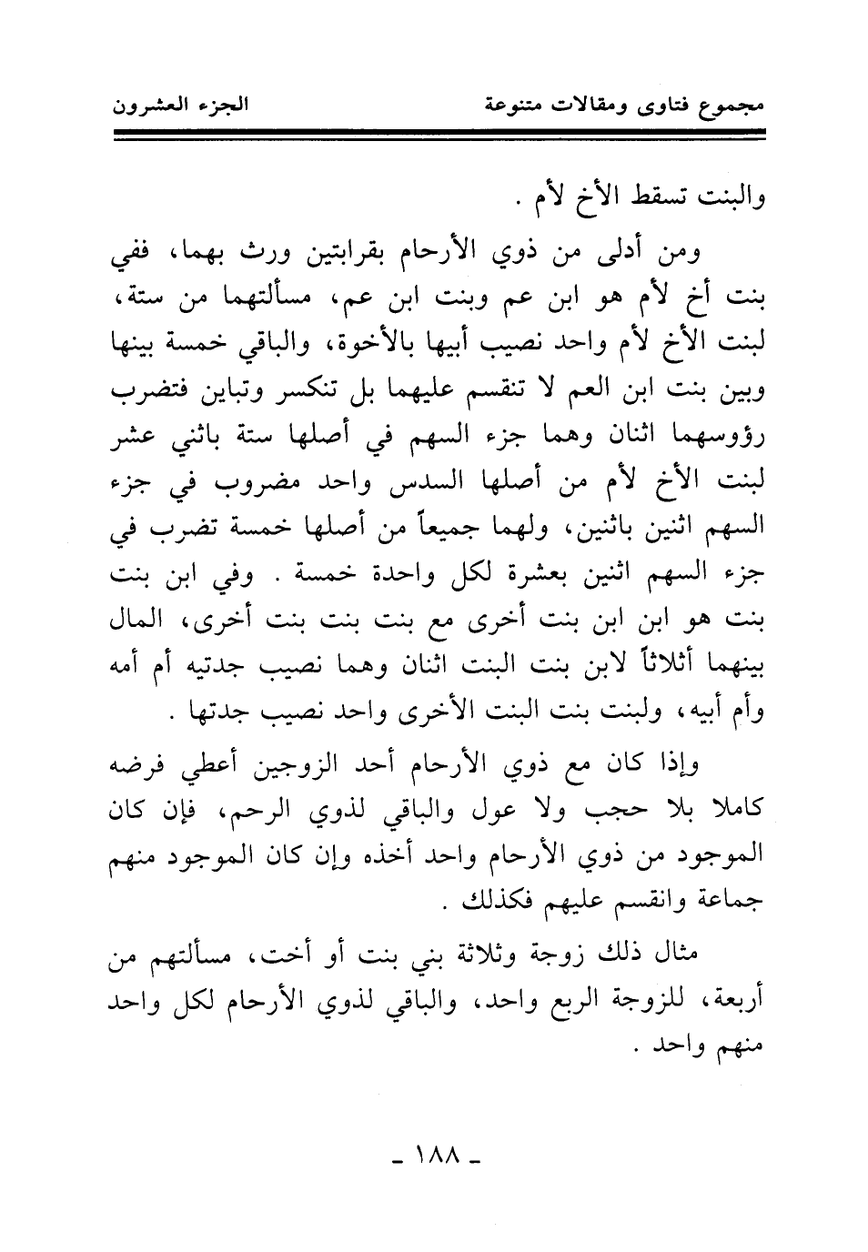 ومن أدلى من ذوي الأرحام بقرابتين ورث بهما، ففي بنت أخ لأم هو ابن عم وبنت ابن عم، مسألتهما من ستة، لبنت الأخ لأم واحد نصيب أبيها بالإخوة، والباقي خمسة بينها وبين بنت ابن العم لا تنقسم عليهما بل تنكسر وتباين فتضرب رءوسهما اثنان وهما جزء السهم في أصلها ستة باثني عشر لبنت الأخ لأم من أصلها السدس واحد مضروب في جزء السهم اثنين باثنين، ولهما جميعا من أصلها خمسة تضرب في جزء السهم اثنين بعشرة لكل واحدة خمسة. وفي ابن بنت بنت هو ابن ابن بنت أخرى مع بنت بنت بنت أخرى، المال بينهما أثلاثا لابن بنت البنت اثنان وهما نصيب جدتيه أم أمه وأم أبيه، ولبنت بنت البنت الأخرى واحد نصيب جدتها.
