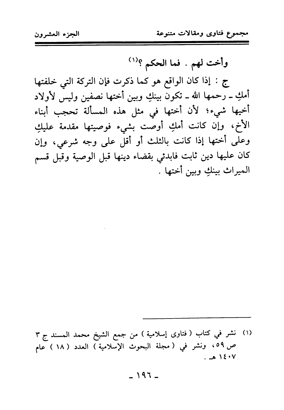 ج: إذا كان الواقع هو كما ذكرت فإن التركة التي خلفتها أمك - رحمها الله - تكون بينك وبين أختها نصفين وليس لأولاد أخيها شيء؛ لأن أختها في مثل هذه المسألة تحجب أبناء الأخ، وإن كانت أمك أوصت بشيء فوصيتها مقدمة عليك وعلى أختها إذا كانت بالثلث أو أقل على وجه شرعي، وإن كان عليها دين ثابت فابدئي بقضاء دينها قبل الوصية وقبل قسم الميراث بينك وبين أختها.