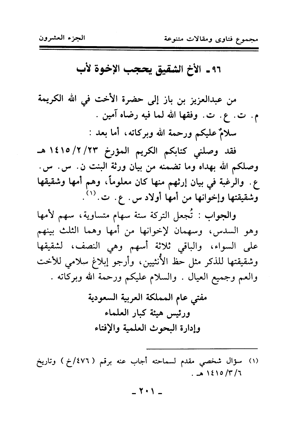 فقد وصلني كتابكم الكريم المؤرخ 23 \ 2 \ 1415 هـ وصلكم الله بهداه وما تضمنه من بيان ورثة البنت ن. س. س. ع. والرغبة في بيان إرثهم منها كان معلوما، وهم أمها وشقيقها وشقيقتها وإخوانها من أمها أولاد س. ع. ت. (¬1) .