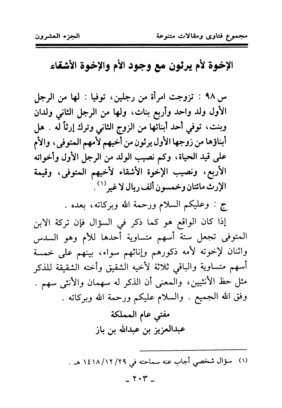 س 98: تزوجت امرأة من رجلين، توفيا: لها من الرجل الأول ولد واحد وأربع بنات، ولها من الرجل الثاني ولدان وبنت، توفي أحد أبنائها من الزوج الثاني وترك إرثا له. هل أبناؤها من زوجها الأول يرثون من أخيهم لأمهم المتوفى، والأم على قيد الحياة، وكم نصيب الولد من الرجل الأول وأخواته الأربع، ونصيب الإخوة الأشقاء لأخيهم المتوفى، وقيمة الإرث مائتان وخمسون ألف ريال لا غير (¬1) .