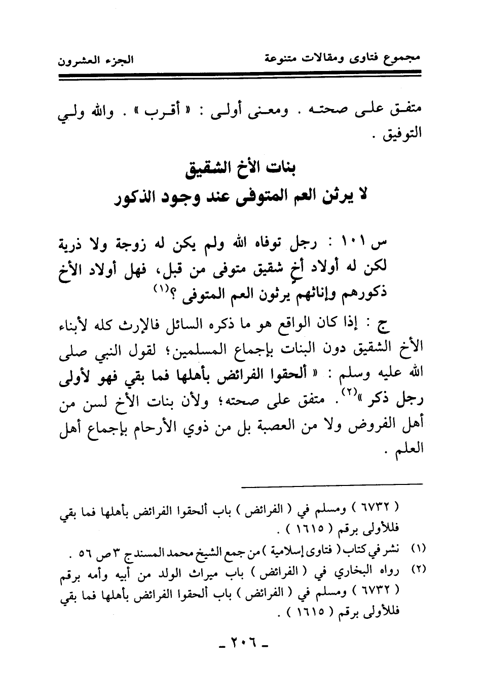 ج: إذا كان الواقع هو ما ذكره السائل فالإرث كله لأبناء الأخ الشقيق دون البنات بإجماع المسلمين؛ لقول النبي صلى الله عليه وسلم: «ألحقوا الفرائض بأهلها فما بقي فهو لأولى رجل ذكر (¬2) » متفق على صحته؛ ولأن بنات الأخ لسن من أهل الفروض ولا من العصبة بل من ذوي الأرحام بإجماع أهل العلم.