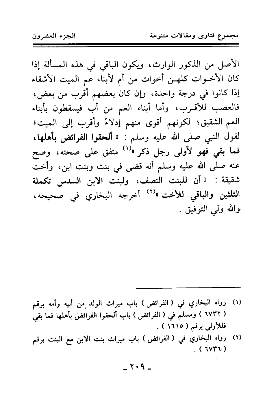 (¬1) رواه البخاري في (الفرائض) باب ميراث الولد من أبيه وأمه برقم (6732) ومسلم في (الفرائض) باب ألحقوا الفرائض بأهلها فما بقي فللأولى برقم (1615) .