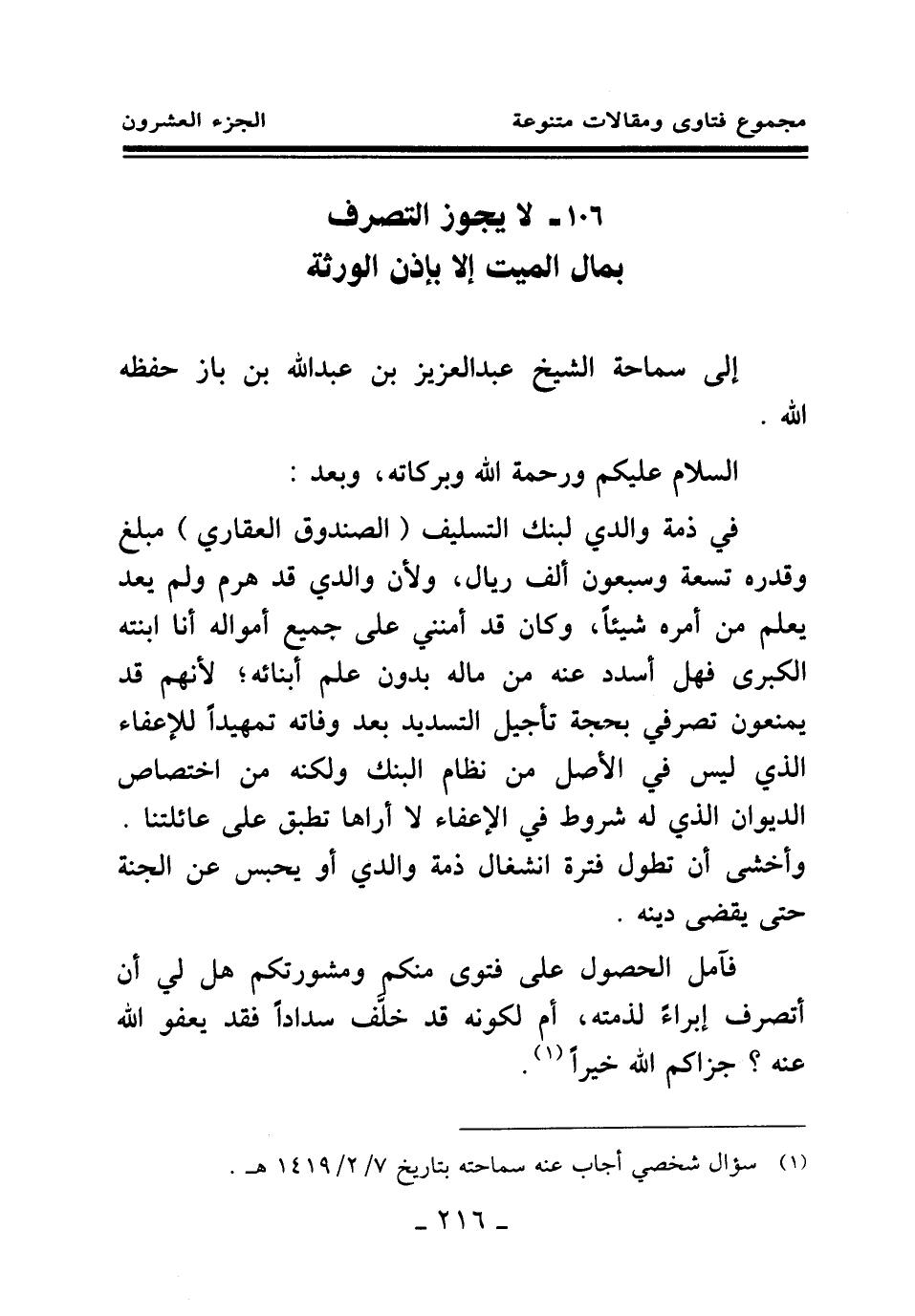 106 - لا يجوز التصرف بمال الميت إلا بإذن الورثة