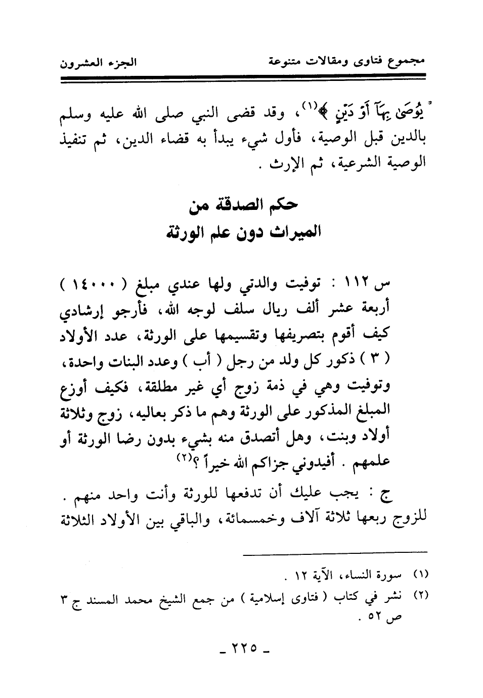 س 112: توفيت والدتي ولها عندي مبلغ (14000) أربعة عشر ألف ريال سلف لوجه الله، فأرجو إرشادي كيف أقوم بتصريفها وتقسيمها على الورثة، عدد الأولاد (3) ذكور كل ولد من رجل (أب) وعدد البنات واحدة، وتوفيت وهي في ذمة زوج أي غير مطلقة، فكيف أوزع المبلغ المذكور على الورثة وهم ما ذكر بعاليه، زوج وثلاثة أولاد وبنت، وهل أتصدق منه بشيء بدون رضا الورثة أو علمهم. أفيدوني جزاكم الله خيرا؟ (¬1) .