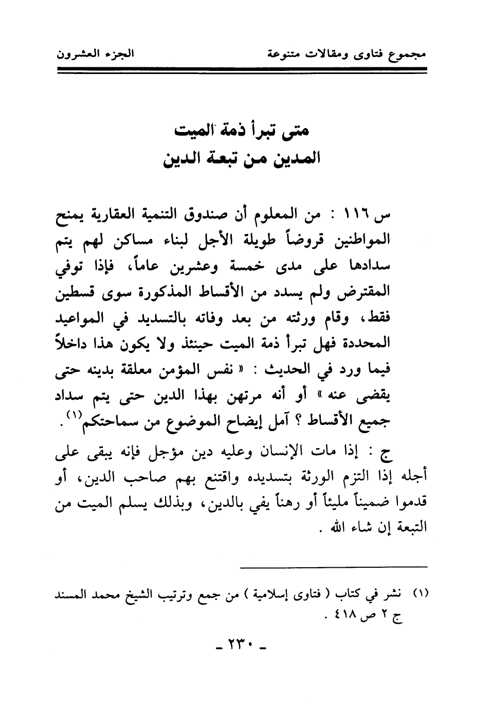 س 116: من المعلوم أن صندوق التنمية العقارية يمنح المواطنين قروضا طويلة الأجل لبناء مساكن لهم يتم سدادها على مدى خمسة وعشرين عاما، فإذا توفي المقترض ولم يسدد من الأقساط المذكورة سوى قسطين فقط، وقام ورثته من بعد وفاته بالتسديد في المواعيد المحددة فهل تبرأ ذمة الميت حينئذ ولا يكون هذا داخلا فيما ورد في الحديث: «نفس المؤمن معلقة بدينه حتى يقضى عنه (¬1) » أو أنه مرتهن بهذا الدين حتى يتم سداد جميع الأقساط؟ آمل إيضاح الموضوع من سماحتكم (¬2) .
