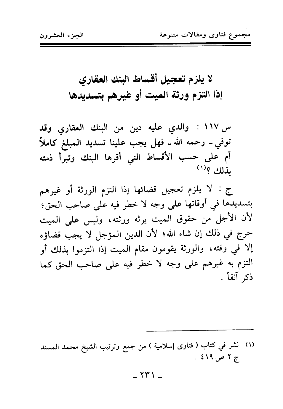 س 117: والدي عليه دين من البنك العقاري وقد توفي - رحمه الله - فهل يجب علينا تسديد المبلغ كاملا أم على حسب الأقساط التي أقرها البنك وتبرأ ذمته بذلك؟ (¬1) .