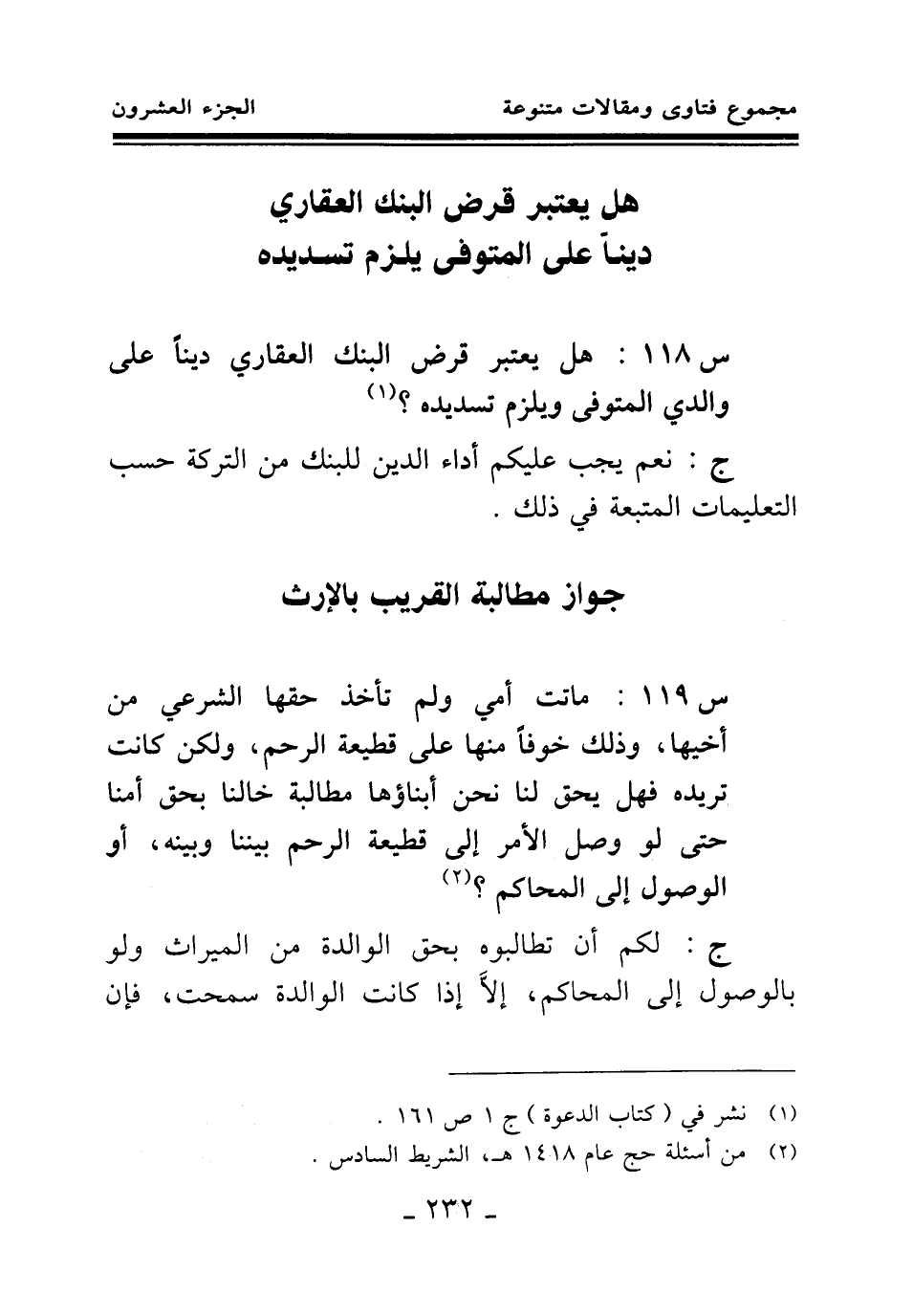س 118: هل يعتبر قرض البنك العقاري دينا على والدي المتوفى ويلزم تسديده؟ (¬1) .