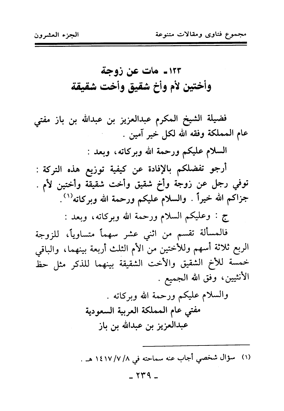 أرجو تفضلكم بالإفادة عن كيفية توزيع هذه التركة: توفي رجل عن زوجة وأخ شقيق وأخت شقيقة وأختين لأم. جزاكم الله خيرا. والسلام عليكم ورحمة الله وبركاته (¬1) .