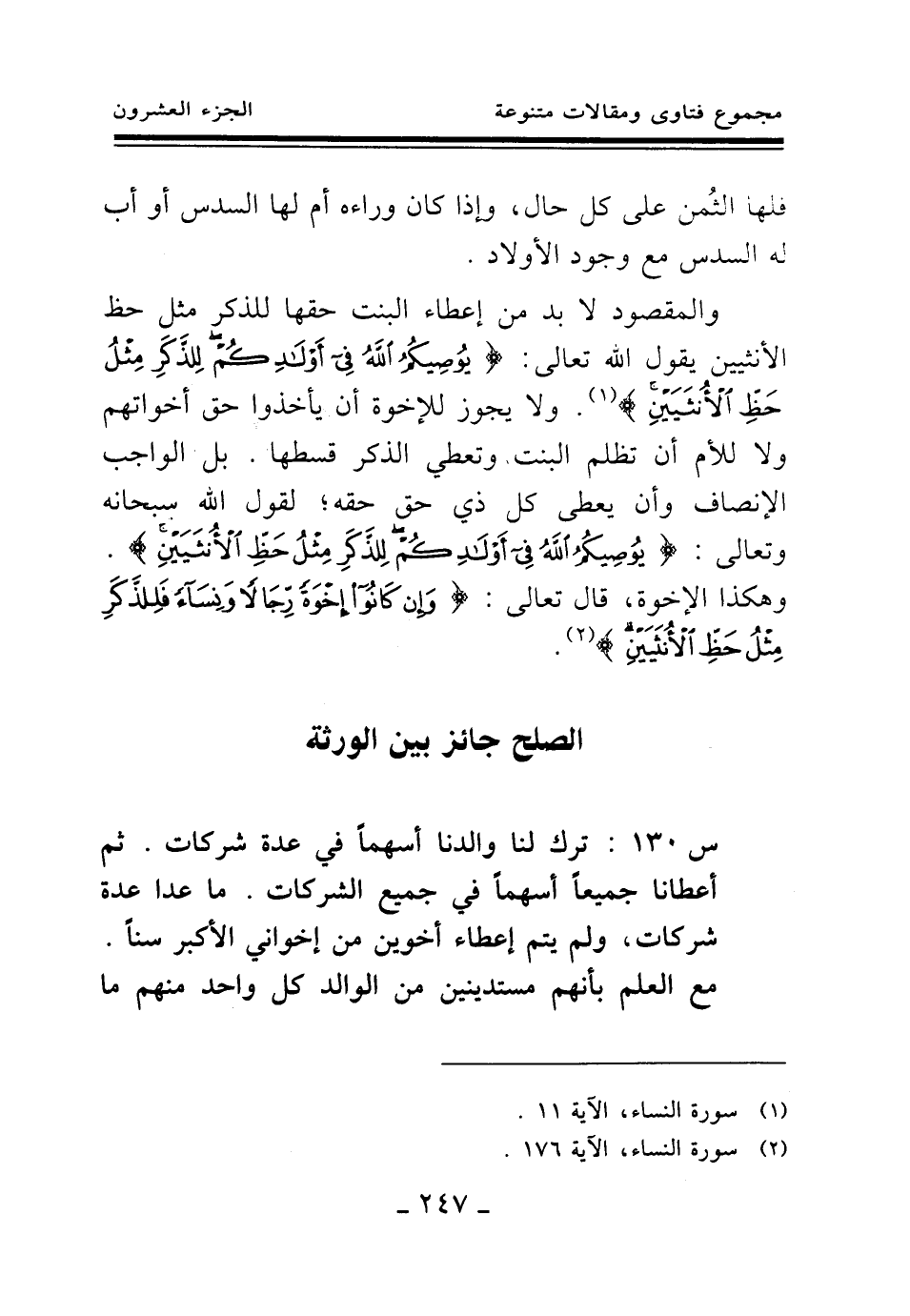 والمقصود لا بد من إعطاء البنت حقها للذكر مثل حظ الأنثيين يقول الله تعالى: {يُوصِيكُمُ اللَّهُ فِي أَوْلَادِكُمْ لِلذَّكَرِ مِثْلُ حَظِّ الْأُنْثَيَيْنِ} (¬1) ولا يجوز للإخوة أن يأخذوا حق أخواتهم ولا للأم أن تظلم البنت وتعطي الذكر قسطها. بل الواجب الإنصاف وأن يعطى كل ذي حق حقه؛ لقول الله سبحانه وتعالى: {يُوصِيكُمُ اللَّهُ فِي أَوْلَادِكُمْ لِلذَّكَرِ مِثْلُ حَظِّ الْأُنْثَيَيْنِ} (¬2) وهكذا الإخوة، قال تعالى: {وَإِنْ كَانُوا إِخْوَةً رِجَالًا وَنِسَاءً فَلِلذَّكَرِ مِثْلُ حَظِّ الْأُنْثَيَيْنِ} (¬3)
