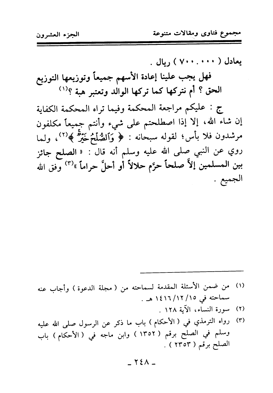 (¬3) رواه الترمذي في (الأحكام) باب ما ذكر عن الرسول صلى الله عليه وسلم في الصلح برقم (1352) وابن ماجه في (الأحكام) باب الصلح برقم (2353) .