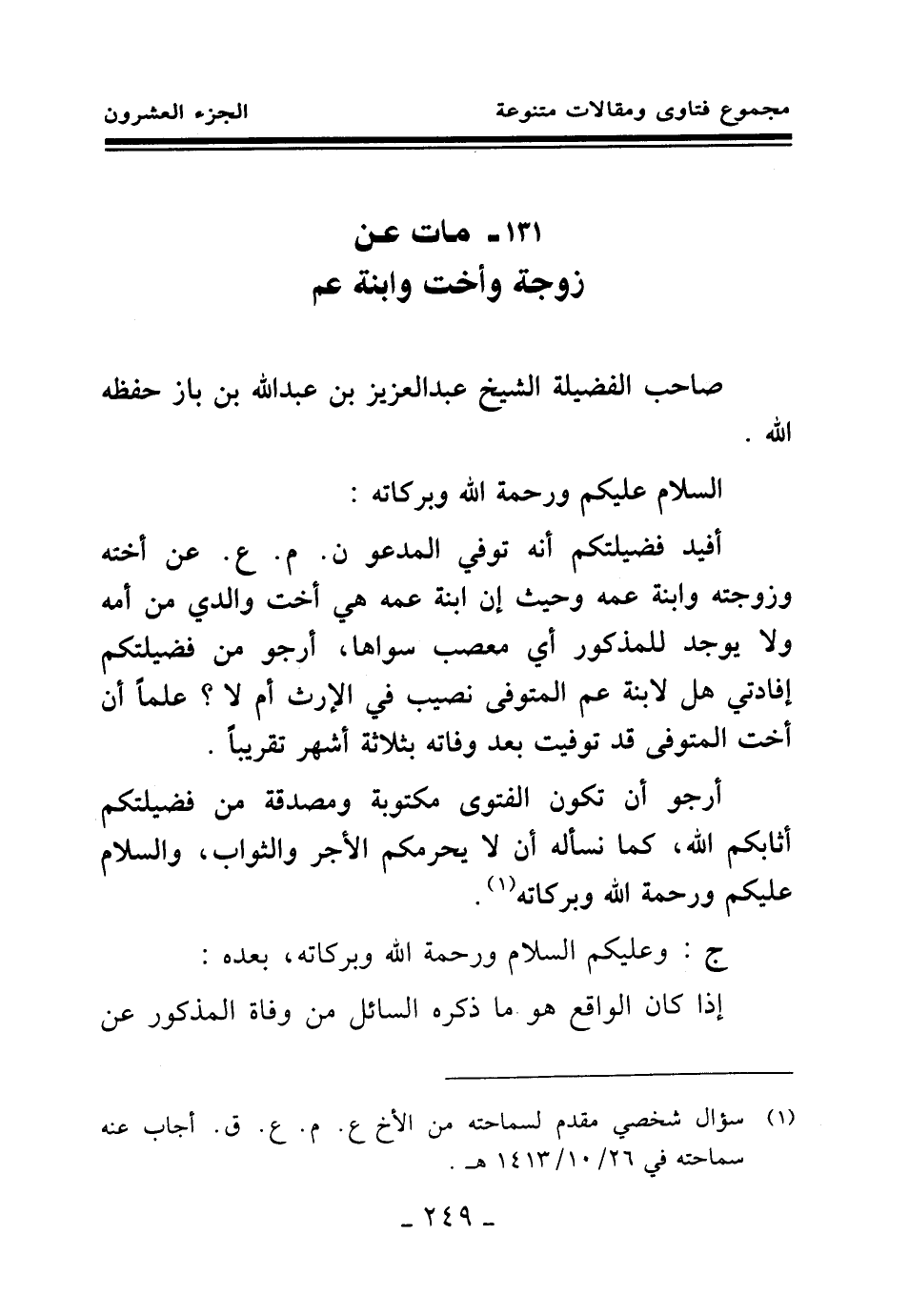 أرجو أن تكون الفتوى مكتوبة ومصدقة من فضيلتكم أثابكم الله، كما نسأله أن لا يحرمكم الأجر والثواب، والسلام عليكم ورحمة الله وبركاته (¬1) .