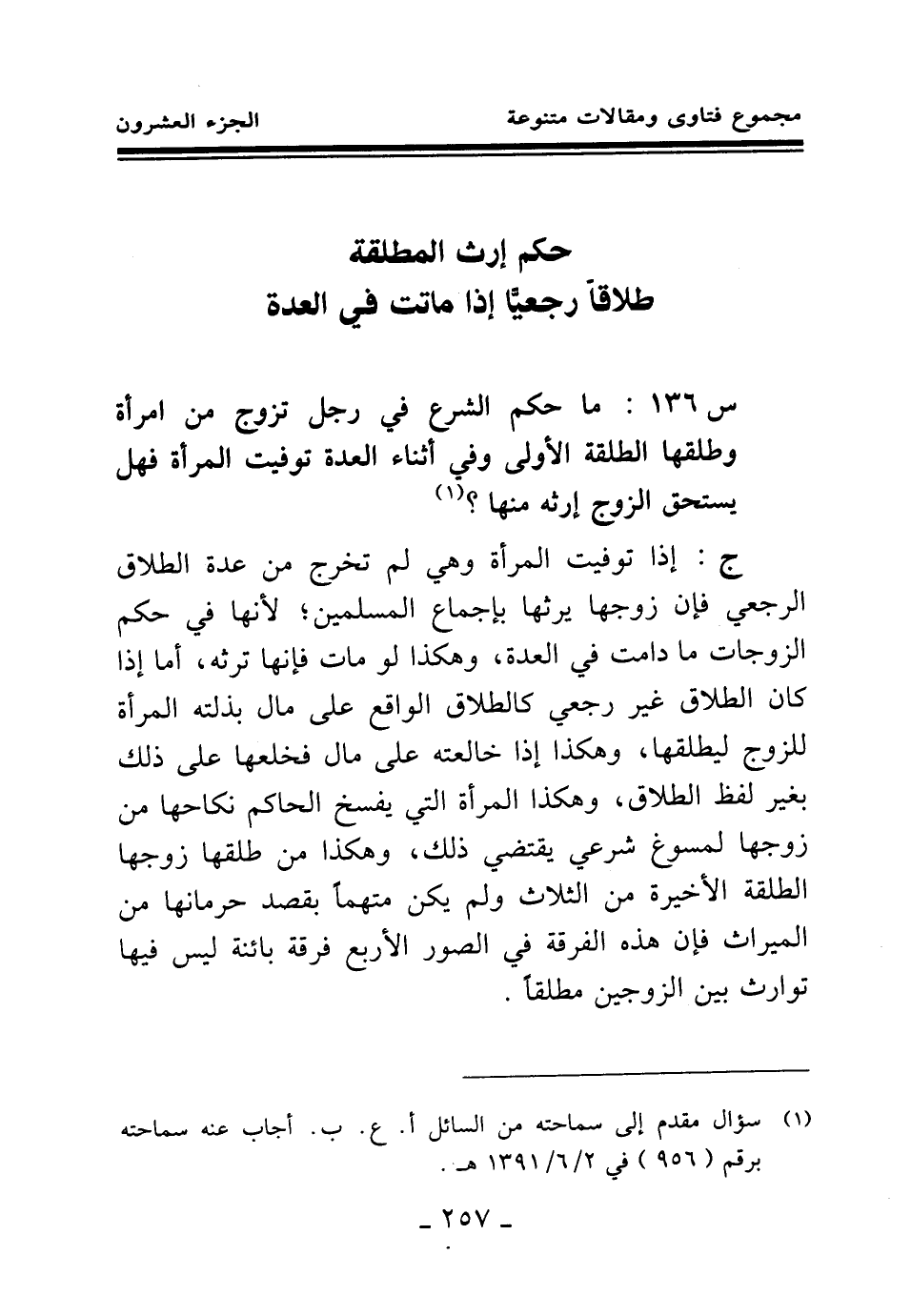 س 136: ما حكم الشرع في رجل تزوج من امرأة وطلقها الطلقة الأولى وفي أثناء العدة توفيت المرأة فهل يستحق الزوج إرثه منها؟ (¬1) .