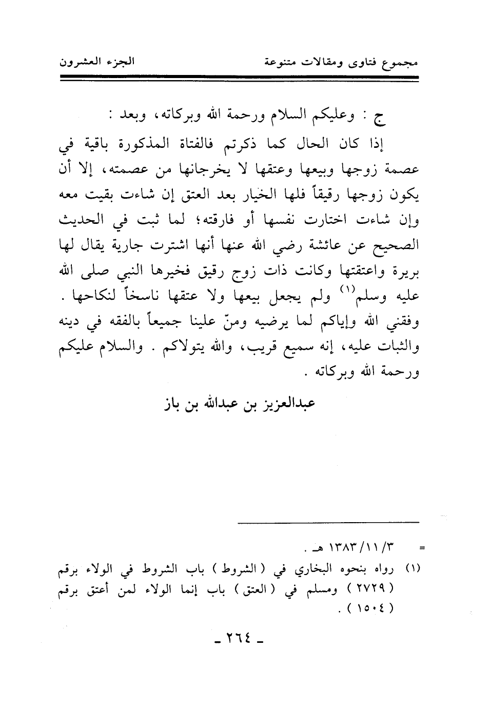 إذا كان الحال كما ذكرتم فالفتاة المذكورة باقية في عصمة زوجها وبيعها وعتقها لا يخرجانها من عصمته، إلا أن يكون زوجها رقيقا فلها الخيار بعد العتق إن شاءت بقيت معه وإن شاءت اختارت نفسها أو فارقته؛ لما ثبت في الحديث الصحيح «عن عائشة رضي الله عنها أنها اشترت جارية يقال لها بريرة وأعتقتها وكانت ذات زوج رقيق فخيرها النبي صلى الله عليه وسلم (¬1) » ولم يجعل بيعها ولا عتقها ناسخا لنكاحها. وفقني الله وإياكم لما يرضيه ومن علينا جميعا بالفقه في دينه والثبات عليه، إنه سميع قريب، والله يتولاكم. والسلام عليكم ورحمة الله وبركاته.