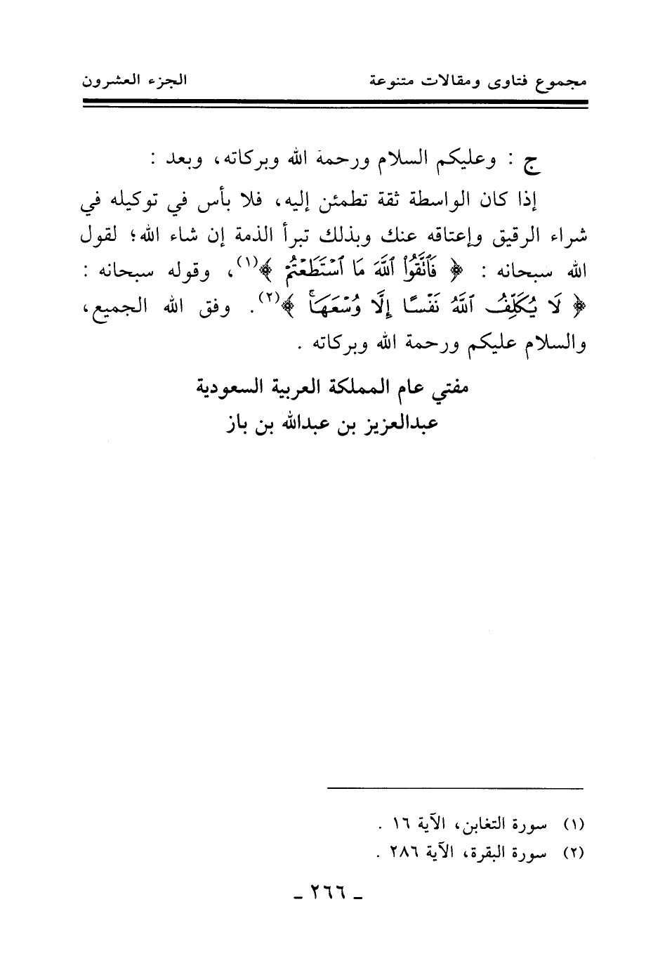إذا كان الواسطة ثقة تطمئن إليه، فلا بأس في توكيله في شراء الرقيق وإعتاقه عنك وبذلك تبرأ الذمة إن شاء الله؛ لقول الله سبحانه: {فَاتَّقُوا اللَّهَ مَا اسْتَطَعْتُمْ} (¬1) وقوله سبحانه: {لَا يُكَلِّفُ اللَّهُ نَفْسًا إِلَّا وُسْعَهَا} (¬2) وفق الله الجميع، والسلام عليكم ورحمة الله وبركاته.