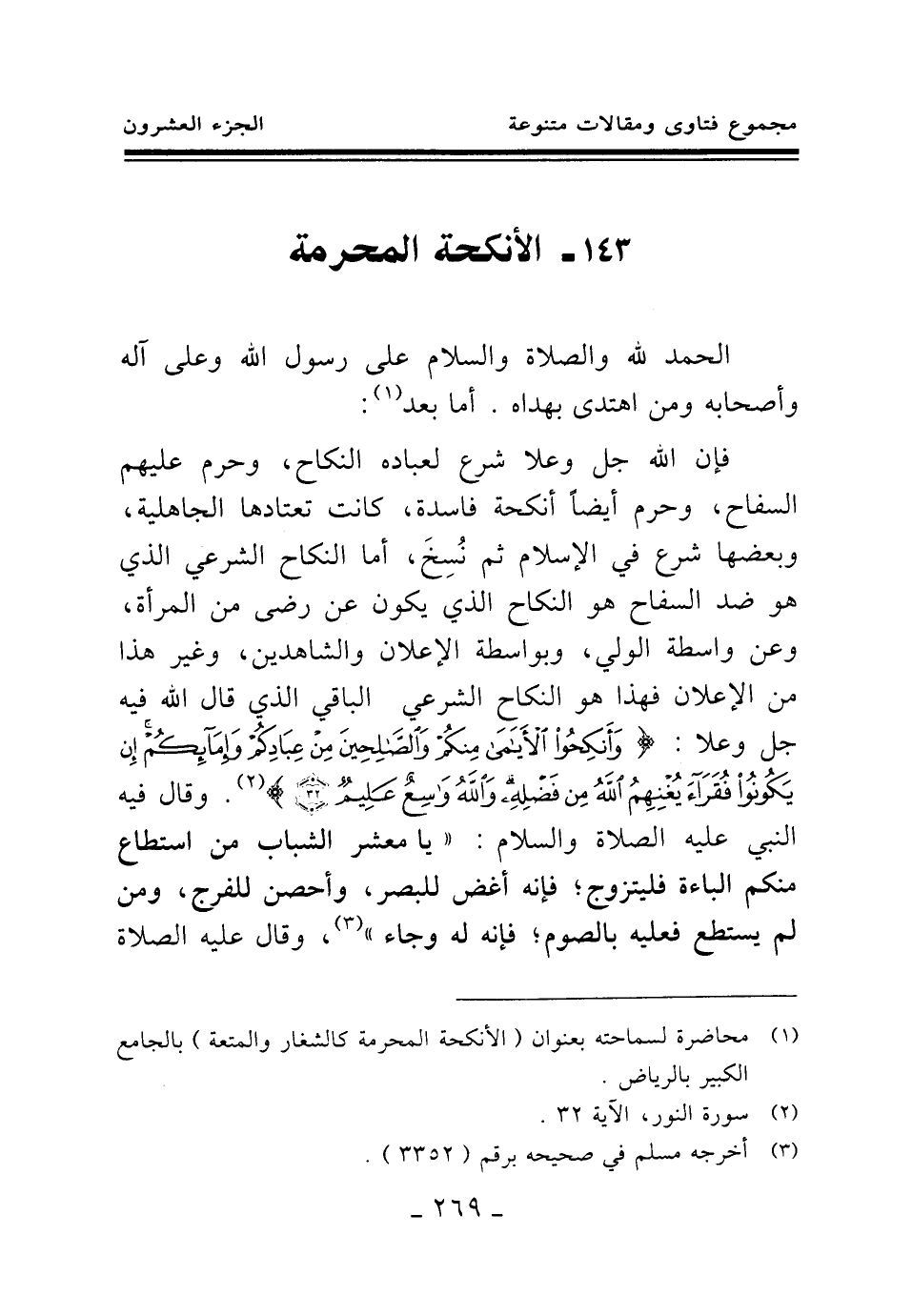 (¬1) محاضرة لسماحته بعنوان (الأنكحة المحرمة كالشغار والمتعة) بالجامع الكبير بالرياض.