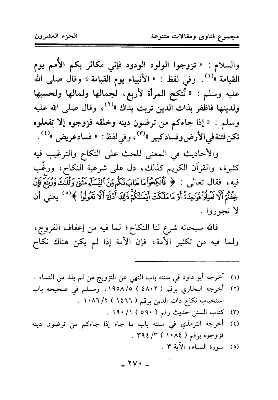 والأحاديث في المعنى للحث على النكاح والترغيب فيه كثيرة، والقرآن الكريم كذلك، دل على شرعية النكاح، ورغب فيه، قال تعالى: {فَانْكِحُوا مَا طَابَ لَكُمْ مِنَ النِّسَاءِ مَثْنَى وَثُلَاثَ وَرُبَاعَ فَإِنْ خِفْتُمْ أَلَّا تَعْدِلُوا فَوَاحِدَةً أَوْ مَا مَلَكَتْ أَيْمَانُكُمْ ذَلِكَ أَدْنَى أَلَّا تَعُولُوا} (¬5) يعني أن لا تجوروا.