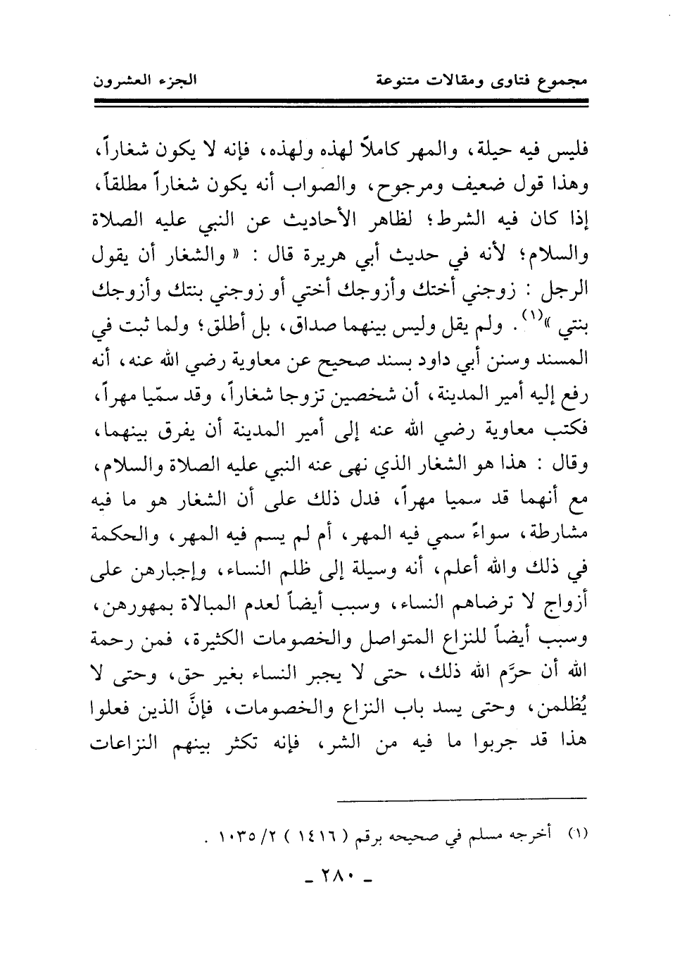 فليس فيه حيلة، والمهر كاملا لهذه ولهذه، فإنه لا يكون شغارا، وهذا قول ضعيف ومرجوح، والصواب أنه يكون شغارا مطلقا، إذا كان فيه الشرط؛ لظاهر الأحاديث عن النبي عليه الصلاة والسلام؛ لأنه في حديث أبي هريرة قال: والشغار أن يقول الرجل: زوجني أختك وأزوجك أختي أو زوجني بنتك وأزوجك بنتي (¬1) . ولم يقل: وليس بينهما صداق، بل أطلق؛ ولما ثبت في المسند وسنن أبي داود بسند صحيح عن معاوية رضي الله عنه، «أنه رفع إليه أمير المدينة، أن شخصين تزوجا شغارا، وقد سميا مهرا، فكتب معاوية رضي الله عنه إلى أمير المدينة أن يفرق بينهما، وقال: هذا هو الشغار الذي نهى عنه النبي عليه الصلاة والسلام (¬2) » مع أنهما قد سميا مهرا، فدل ذلك على أن الشغار هو ما فيه مشارطة، سواء سمي فيه المهر، أم لم يسم فيه المهر، والحكمة في ذلك والله أعلم، أنه وسيلة إلى ظلم النساء، وإجبارهن على أزواج لا ترضاهم النساء، وسبب أيضا لعدم المبالاة بمهورهن، وسبب أيضا للنزاع المتواصل والخصومات الكثيرة، فمن رحمة الله أن حرم الله ذلك، حتى لا يجبر النساء بغير حق، وحتى لا يظلمن، وحتى يسد باب النزاع والخصومات، فإن الذين فعلوا هذا قد جربوا ما فيه من الشر، فإنه تكثر بينهم النزاعات