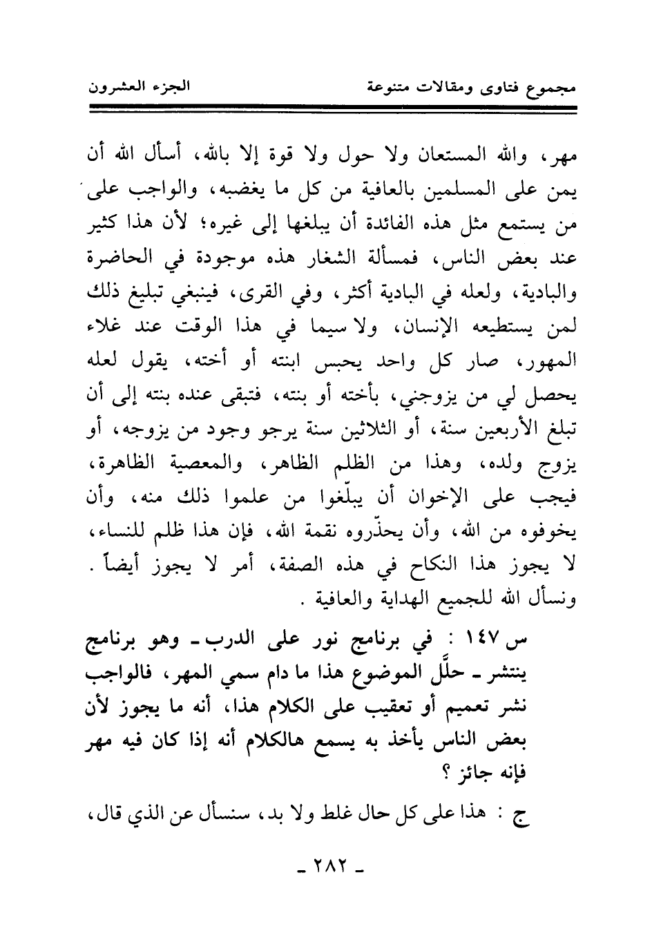 س 147: في برنامج نور على الدرب - وهو برنامج ينتشر - حلل الموضوع هذا ما دام سمي المهر، فالواجب نشر تعميم أو تعقيب على الكلام هذا، أنه ما يجوز لأن بعض الناس يأخذ به يسمع هالكلام أنه إذا كان فيه مهر فإنه جائز؟