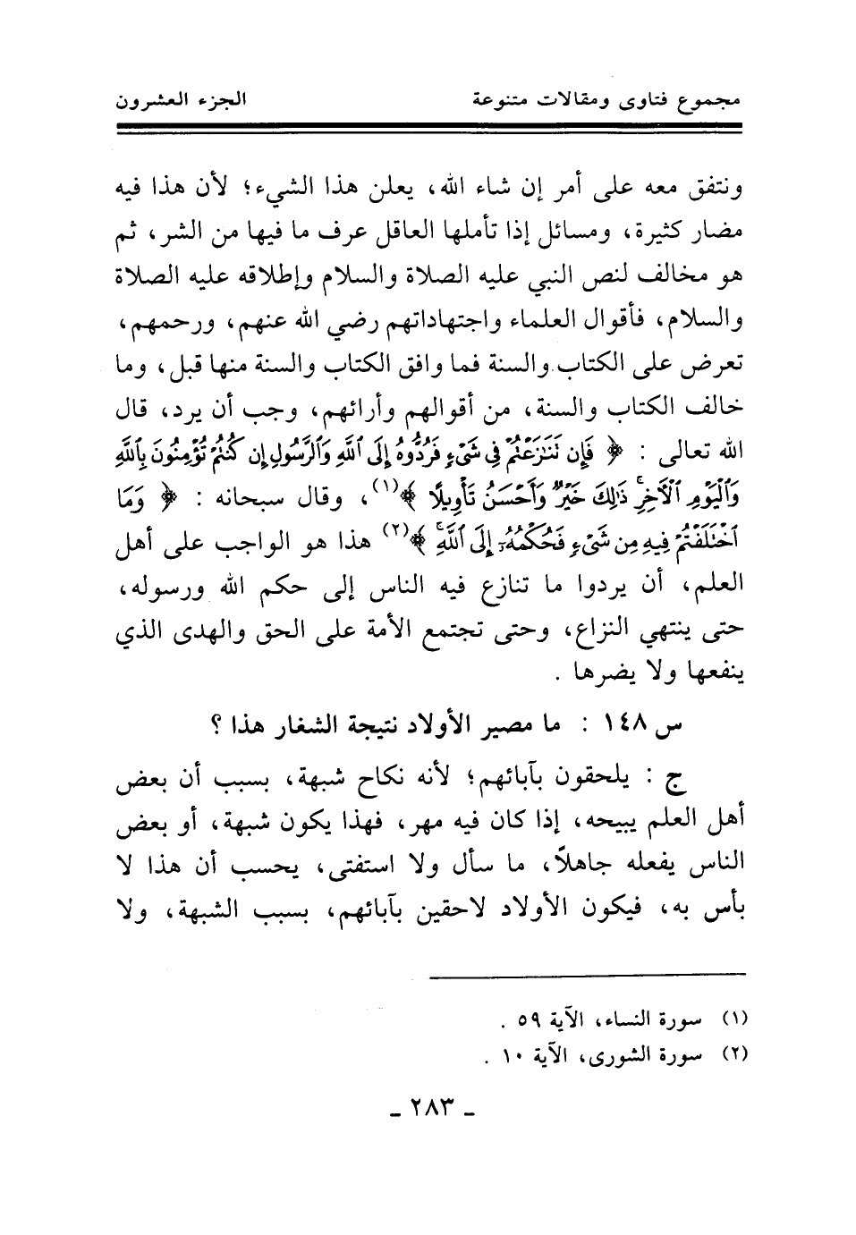 ونتفق معه على أمر إن شاء الله، يعلن هذا الشيء؛ لأن هذا فيه مضار كثيرة، ومسائل إذا تأملها العاقل عرف ما فيها من الشر، ثم هو مخالف لنص النبي عليه الصلاة والسلام وإطلاقه عليه الصلاة والسلام، فأقوال العلماء واجتهاداتهم رضي الله عنهم، ورحمهم، تعرض على الكتاب والسنة فما وافق الكتاب والسنة منها قبل، وما خالف الكتاب والسنة، من أقوالهم وآرائهم، وجب أن يرد، قال الله تعالى: {فَإِنْ تَنَازَعْتُمْ فِي شَيْءٍ فَرُدُّوهُ إِلَى اللَّهِ وَالرَّسُولِ إِنْ كُنْتُمْ تُؤْمِنُونَ بِاللَّهِ وَالْيَوْمِ الْآخِرِ ذَلِكَ خَيْرٌ وَأَحْسَنُ تَأْوِيلًا} (¬1) وقال سبحانه: {وَمَا اخْتَلَفْتُمْ فِيهِ مِنْ شَيْءٍ فَحُكْمُهُ إِلَى اللَّهِ} (¬2) هذا هو الواجب على أهل العلم، أن يردوا ما تنازع فيه الناس إلى حكم الله ورسوله، حتى ينتهي النزاع، وحتى تجتمع الأمة على الحق والهدى الذي ينفعها ولا يضرها.