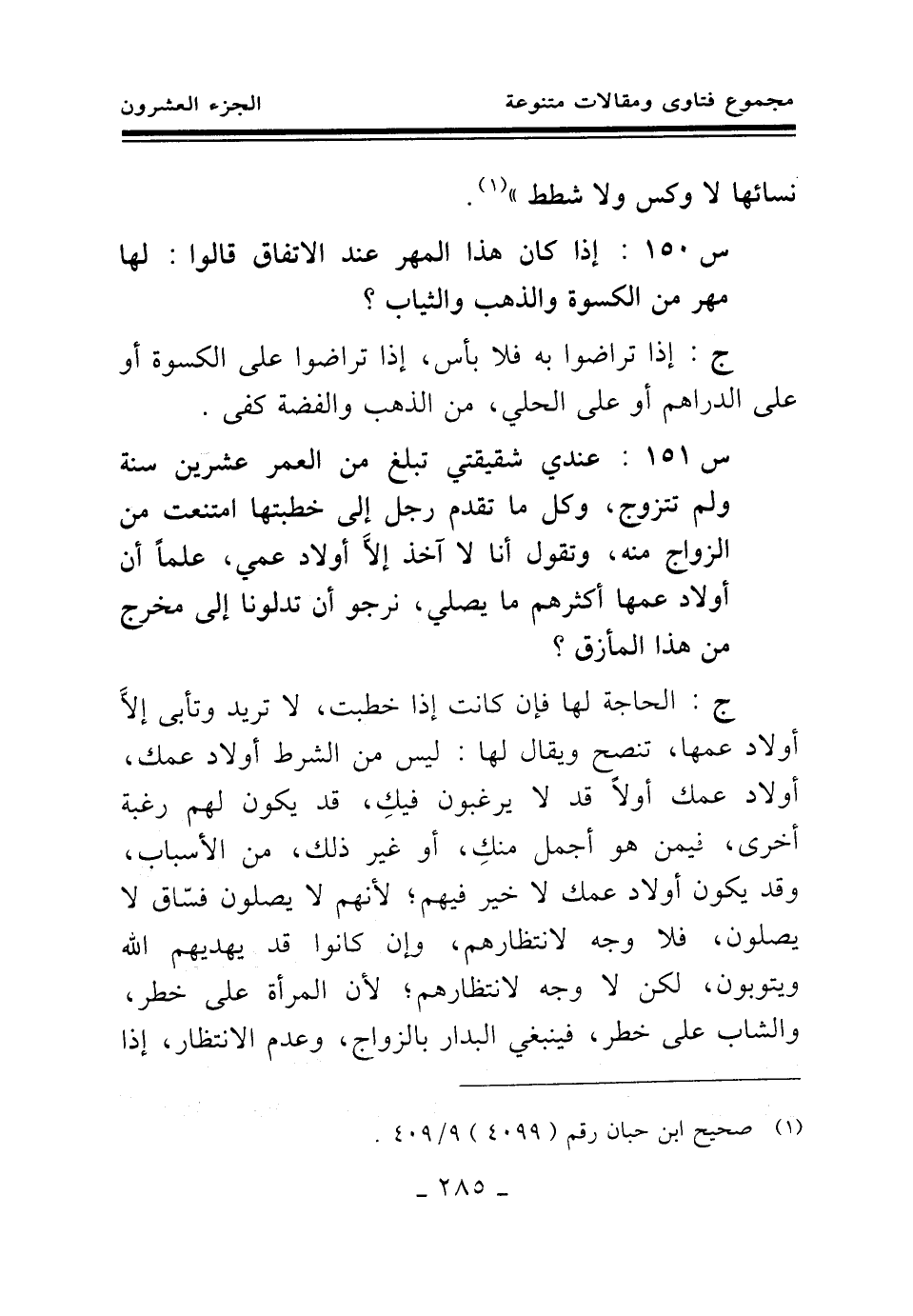 س 151: عندي شقيقتي تبلغ من العمر عشرين سنة ولم تتزوج، وكلما تقدم رجل إلى خطبتها امتنعت من الزواج منه، وتقول أنا لا آخذ إلا أولاد عمي، علما أن أولاد عمها أكثرهم ما يصلي، نرجو أن تدلونا إلى مخرج من هذا المأزق؟