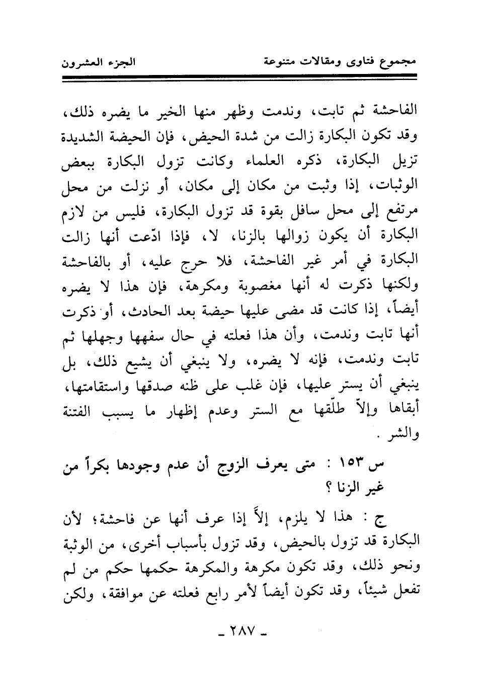 س 153: متى يعرف الزوج أن عدم وجودها بكرا من غير الزنا؟