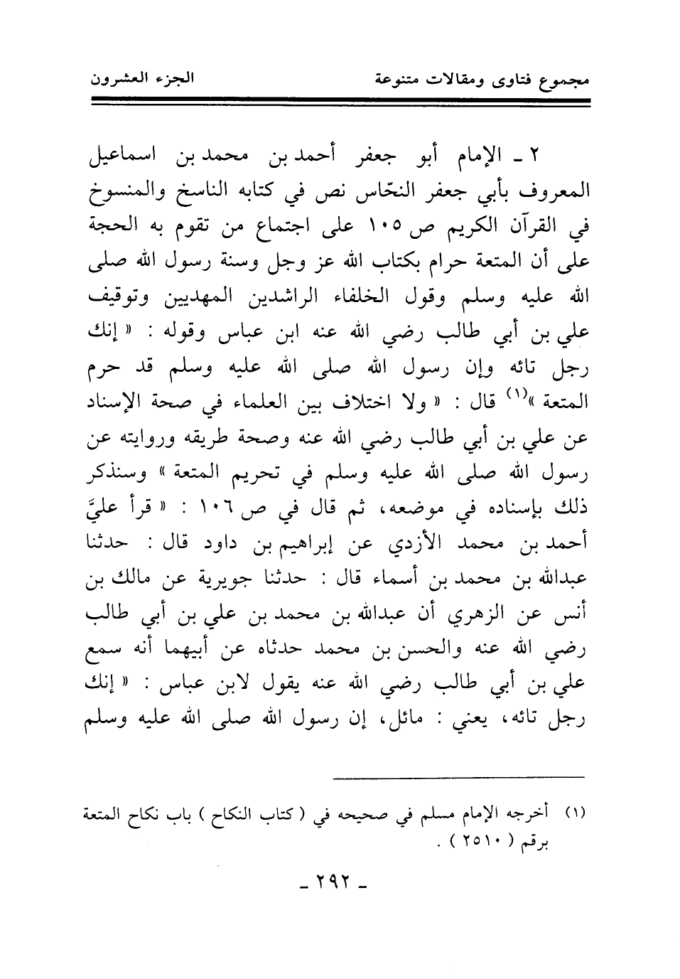 2 - الإمام أبو جعفر أحمد بن محمد بن إسماعيل المعروف بأبي جعفر النحاس نص في كتابه الناسخ والمنسوخ في القرآن الكريم ص 105 على اجتماع من تقوم به الحجة على أن المتعة حرام بكتاب الله عز وجل وسنة رسول الله صلى الله عليه وسلم وقول الخلفاء الراشدين المهديين وتوقيف علي بن أبي طالب رضي الله عنه ابن عباس وقوله: إنك رجل تائه «وإن رسول الله صلى الله عليه وسلم قد حرم المتعة (¬1) » ، قال: " ولا اختلاف بين العلماء في صحة الإسناد عن علي بن أبي طالب رضي الله عنه وصحة طريقه وروايته عن رسول الله صلى الله عليه وسلم في تحريم المتعة " وسنذكر ذلك بإسناده في موضعه، ثم قال في ص 106: " قرأ علي أحمد بن محمد الأزدي عن إبراهيم بن داود قال: حدثنا عبد الله بن محمد بن أسماء قال: حدثنا جويرية عن مالك بن أنس عن الزهري أن عبد الله بن محمد بن علي بن أبي طالب رضي الله عنه والحسن بن محمد حدثاه عن أبيهما أنه سمع علي بن أبي طالب رضي الله عنه يقول لابن عباس: إنك رجل تائه، يعني: مائل، «إن رسول الله صلى الله عليه وسلم