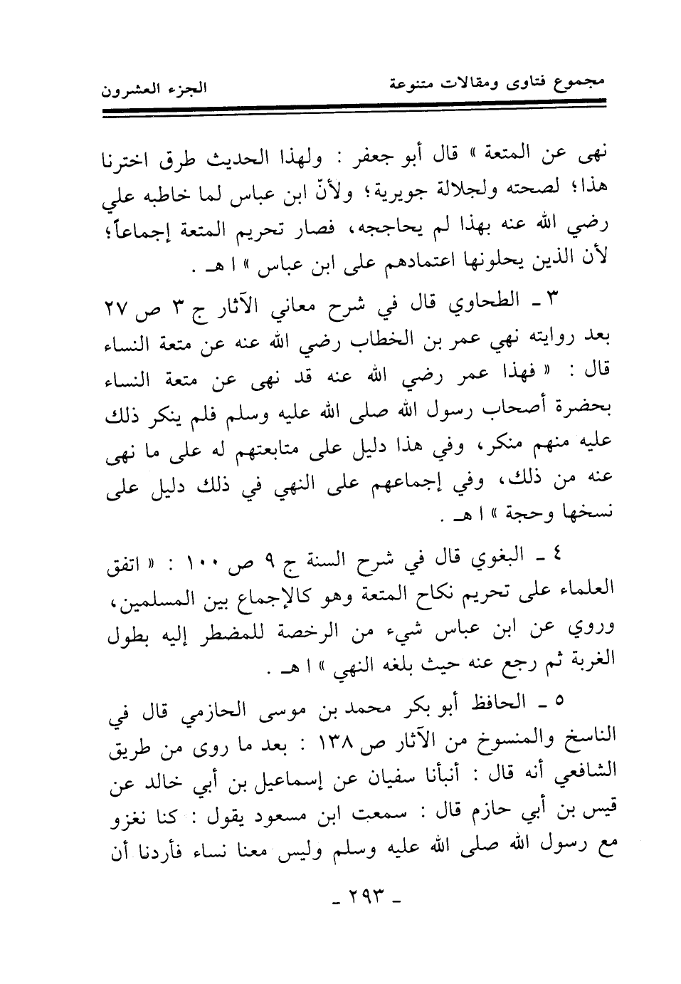 4 - البغوي قال في شرح السنة ج 9 ص 100: " اتفق العلماء على تحريم نكاح المتعة وهو كالإجماع بين المسلمين، وروي عن ابن عباس شيء من الرخصة للمضطر إليه بطول الغربة ثم رجع عنه حيث بلغه النهي " اهـ.