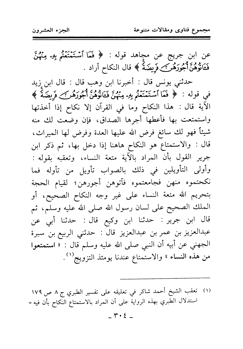 حدثني يونس قال: أخبرنا ابن وهب قال: قال ابن زيد في قوله: {فَمَا اسْتَمْتَعْتُمْ بِهِ مِنْهُنَّ فَآتُوهُنَّ أُجُورَهُنَّ فَرِيضَةً} (¬2) الآية قال: هذا النكاح وما في القرآن إلا نكاح إذا أخذتها واستمتعت بها فأعطها أجرها الصداق، فإن وضعت لك منه شيئا فهو لك سائغ فرض الله عليها العدة وفرض لها الميراث، قال: والاستمتاع هو النكاح هاهنا إذا دخل بها، ثم ذكر ابن جرير القول بأن المراد بالآية متعة النساء، وتعقبه بقوله: وأولى التأويلين في ذلك بالصواب تأويل من تأوله فما نكحتموه منهن فجامعتموه فآتوهن أجورهن؛ لقيام الحجة بتحريم الله متعة النساء على غير وجه النكاح الصحيح، أو الملك الصحيح على لسان رسول الله صلى الله عليه وسلم، ثم قال ابن جرير: حدثنا ابن وكيع قال: حدثنا أبي عن عبد العزيز بن عمر بن عبد العزيز قال: حدثني الربيع بن سبرة الجهني عن أبيه أن النبي صلى الله عليه وسلم قال: «استمتعوا من هذه النساء (¬3) » والاستمتاع عندنا يومئذ التزويج.