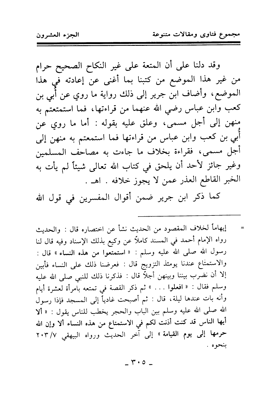 وقد دلنا على أن المتعة على غير النكاح الصحيح حرام من غير هذا الموضع من كتبنا بما أغنى عن إعادته في هذا الموضع، وأضاف ابن جرير إلى ذلك رواية ما روي عن أبي بن كعب وابن عباس رضي الله عنهما من قراءتها، فما استمتعتم به منهن إلى أجل مسمى، وعلق عليه بقوله: أما ما روي عن أبي بن كعب وابن عباس من قراءتها فما استمعتم به منهن إلى أجل مسمى، فقراءة بخلاف ما جاءت به مصاحف المسلمين وغير جائز لأحد أن يلحق في كتاب الله تعالى شيئا لم يأت به الخبر القاطع العذر عمن لا يجوز خلافه. اهـ.