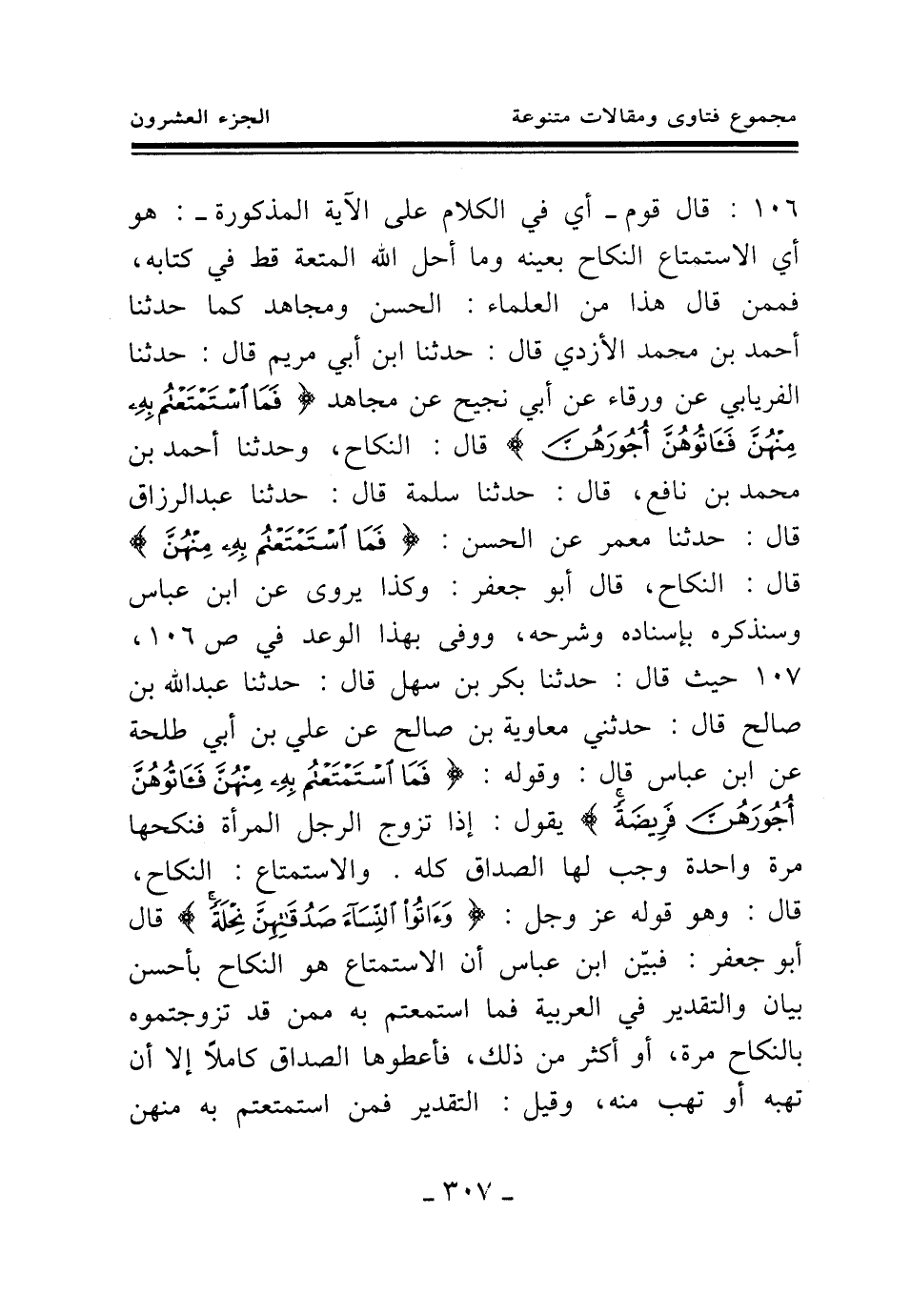 106: قال قوم - أي في الكلام على الآية المذكورة -: هو أي الاستمتاع النكاح بعينه وما أحل الله المتعة قط في كتابه، فممن قال هذا من العلماء: الحسن ومجاهد كما حدثنا أحمد بن محمد الأزدي قال: حدثنا ابن أبي مريم قال: حدثنا الفريابي عن ورقاء عن أبي نجيح عن مجاهد {فَمَا اسْتَمْتَعْتُمْ بِهِ مِنْهُنَّ فَآتُوهُنَّ أُجُورَهُنَّ} (¬1) قال: النكاح، وحدثنا أحمد بن محمد بن نافع، قال: حدثنا سلمة قال: حدثنا عبد الرزاق قال: حدثنا معمر عن الحسن: {فَمَا اسْتَمْتَعْتُمْ بِهِ مِنْهُنَّ} (¬2) قال: النكاح، قال أبو جعفر: وكذا يروى عن ابن عباس وسنذكره بإسناده وشرحه، ووفى بهذا الوعد في ص 106، 107 حيث قال: حدثنا بكر بن سهل قال: حدثنا عبد الله بن صالح قال: حدثني معاوية بن صالح عن علي بن أبي طلحة عن ابن عباس قال: وقوله: {فَمَا اسْتَمْتَعْتُمْ بِهِ مِنْهُنَّ فَآتُوهُنَّ أُجُورَهُنَّ فَرِيضَةً} (¬3) يقول: إذا تزوج الرجل المرأة فنكحها مرة واحدة وجب لها الصداق كله. والاستمتاع: النكاح، قال: وهو قوله عز وجل: {وَآتُوا النِّسَاءَ صَدُقَاتِهِنَّ نِحْلَةً} (¬4) قال أبو جعفر: فبين ابن عباس أن الاستمتاع هو النكاح بأحسن بيان والتقدير في العربية فما استمتعتم به ممن قد تزوجتموه بالنكاح مرة، أو أكثر من ذلك، فأعطوها الصداق كاملا إلا أن تهبه أو تهب منه، وقيل: التقدير فمن استمتعتم به منهن