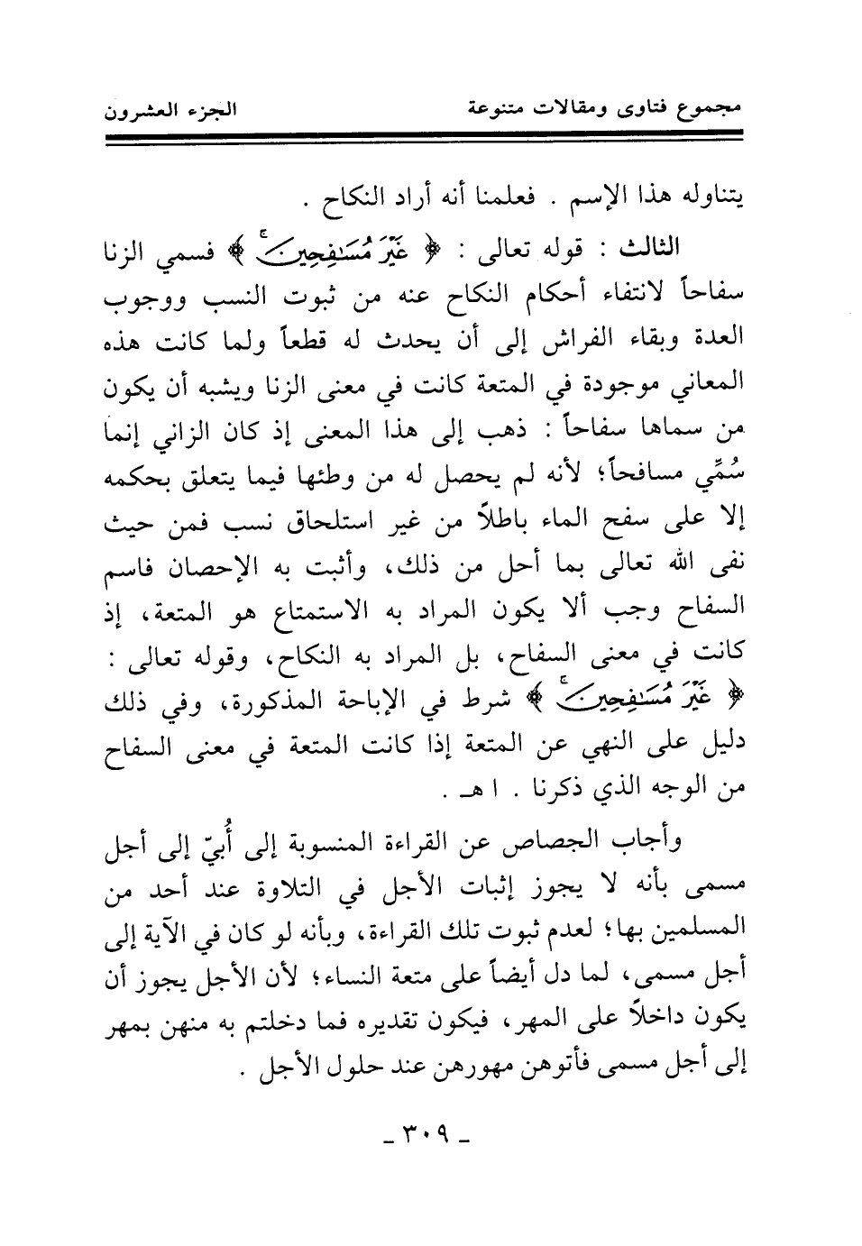 الثالث: قوله تعالى: {غَيْرَ مُسَافِحِينَ} (¬1) فسمي الزنا سفاحا لانتفاء أحكام النكاح عنه من ثبوت النسب ووجوب العدة وبقاء الفراش إلى أن يحدث له قطعا، ولما كانت هذه المعاني موجودة في المتعة كانت في معنى الزنا ويشبه أن يكون من سماها سفاحا: ذهب إلى هذا المعنى إذ كان الزاني إنما سمي مسافحا؛ لأنه لم يحصل له من وطئها فيما يتعلق بحكمه إلا على سفح الماء باطلا من غير استلحاق نسب فمن حيث نفى الله تعالى بما أحل من ذلك، وأثبت به الإحصان فاسم السفاح وجب ألا يكون المراد به الاستمتاع هو المتعة، إذ كانت في معنى السفاح، بل المراد به النكاح، وقوله تعالى: {غَيْرَ مُسَافِحِينَ} (¬2) شرط في الإباحة المذكورة، وفي ذلك دليل على النهي عن المتعة إذا كانت المتعة في معنى السفاح من الوجه الذي ذكرنا. اهـ.