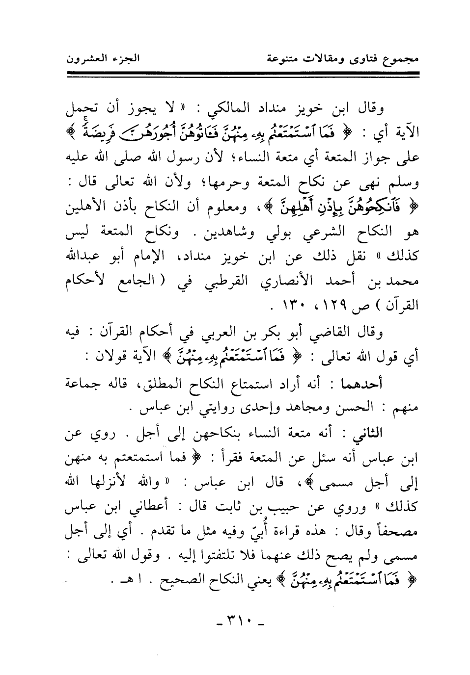 وقال ابن خويز منداد المالكي: " لا يجوز أن تحمل الآية أي: {فَمَا اسْتَمْتَعْتُمْ بِهِ مِنْهُنَّ فَآتُوهُنَّ أُجُورَهُنَّ فَرِيضَةً} (¬1) على جواز المتعة أي متعة النساء؛ لأن رسول الله صلى الله عليه وسلم نهى عن نكاح المتعة وحرمها؛ ولأن الله تعالى قال: {فَانْكِحُوهُنَّ بِإِذْنِ أَهْلِهِنَّ} (¬2) ومعلوم أن النكاح بإذن الأهلين هو النكاح الشرعي بولي وشاهدين. ونكاح المتعة ليس كذلك " نقل ذلك عن ابن خويز منداد، الإمام أبو عبد الله محمد بن أحمد الأنصاري القرطبي في (الجامع لأحكام القرآن) ص 129، 130.