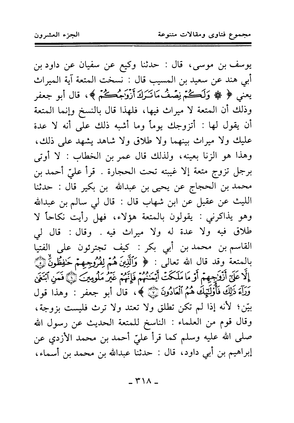 يوسف بن موسى، قال: حدثنا وكيع عن سفيان عن داود بن أبي هند عن سعيد بن المسيب قال: نسخت المتعة آية الميراث يعني {وَلَكُمْ نِصْفُ مَا تَرَكَ أَزْوَاجُكُمْ} (¬1) قال أبو جعفر: وذلك أن المتعة لا ميراث فيها، فلهذا قال بالنسخ وإنما المتعة أن يقول لها: أتزوجك يوما وما أشبه ذلك على أنه لا عدة عليك ولا ميراث بينهما ولا طلاق ولا شاهد يشهد على ذلك، وهذا هو الزنا بعينه، ولذلك قال عمر بن الخطاب: لا أوتى برجل تزوج متعة إلا غيبته تحت الحجارة. قرأ علي أحمد بن محمد بن الحجاج عن يحيى بن عبد الله بن بكير قال: حدثنا الليث عن عقيل عن ابن شهاب قال: قال لي سالم بن عبد الله وهو يذاكرني: يقولون بالمتعة هؤلاء، فهل رأيت نكاحا لا طلاق فيه ولا عدة له ولا ميراث فيه. وقال: قال لي القاسم بن محمد بن أبي بكر: كيف تجترئون على الفتيا بالمتعة وقد قال الله تعالى: {وَالَّذِينَ هُمْ لِفُرُوجِهِمْ حَافِظُونَ} (¬2) {إِلَّا عَلَى أَزْوَاجِهِمْ أوْ مَا مَلَكَتْ أَيْمَانُهُمْ فَإِنَّهُمْ غَيْرُ مَلُومِينَ} (¬3) {فَمَنِ ابْتَغَى وَرَاءَ ذَلِكَ فَأُولَئِكَ هُمُ الْعَادُونَ} (¬4) قال أبو جعفر: وهذا قول بين؛ لأنه إذا لم تكن تطلق ولا تعتد ولا ترث فليست بزوجة، وقال قوم من العلماء: الناسخ للمتعة الحديث عن رسول الله صلى الله عليه وسلم كما قرأ علي أحمد بن محمد الأزدي عن إبراهيم بن أبي داود، قال: حدثنا عبد الله بن محمد بن أسماء،